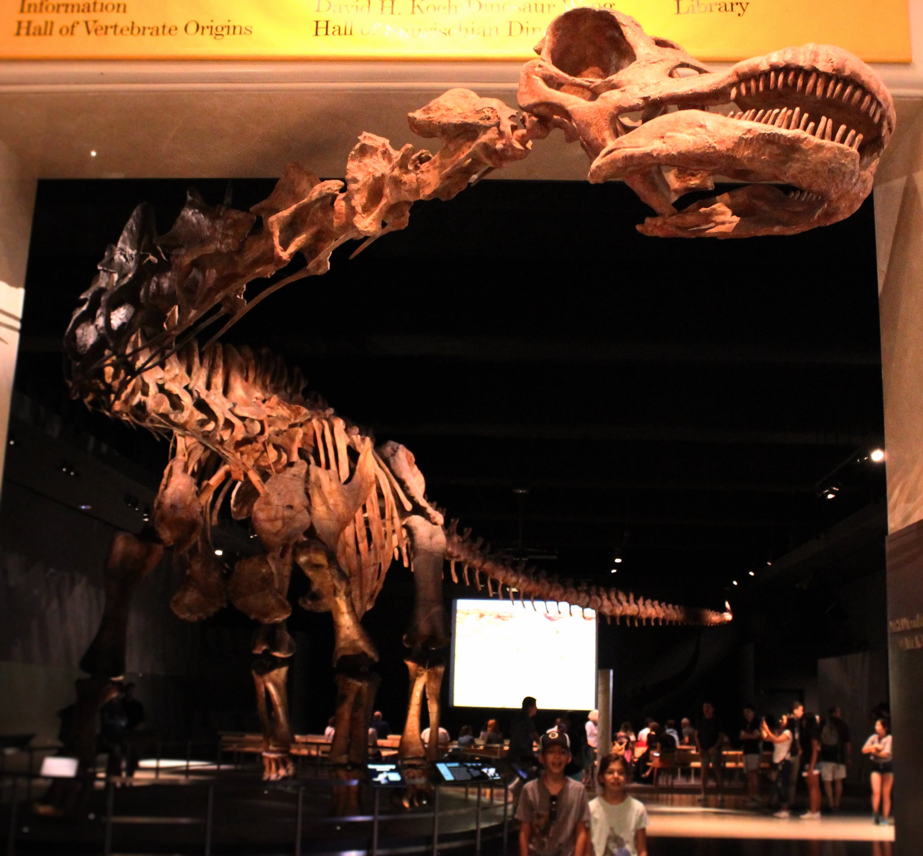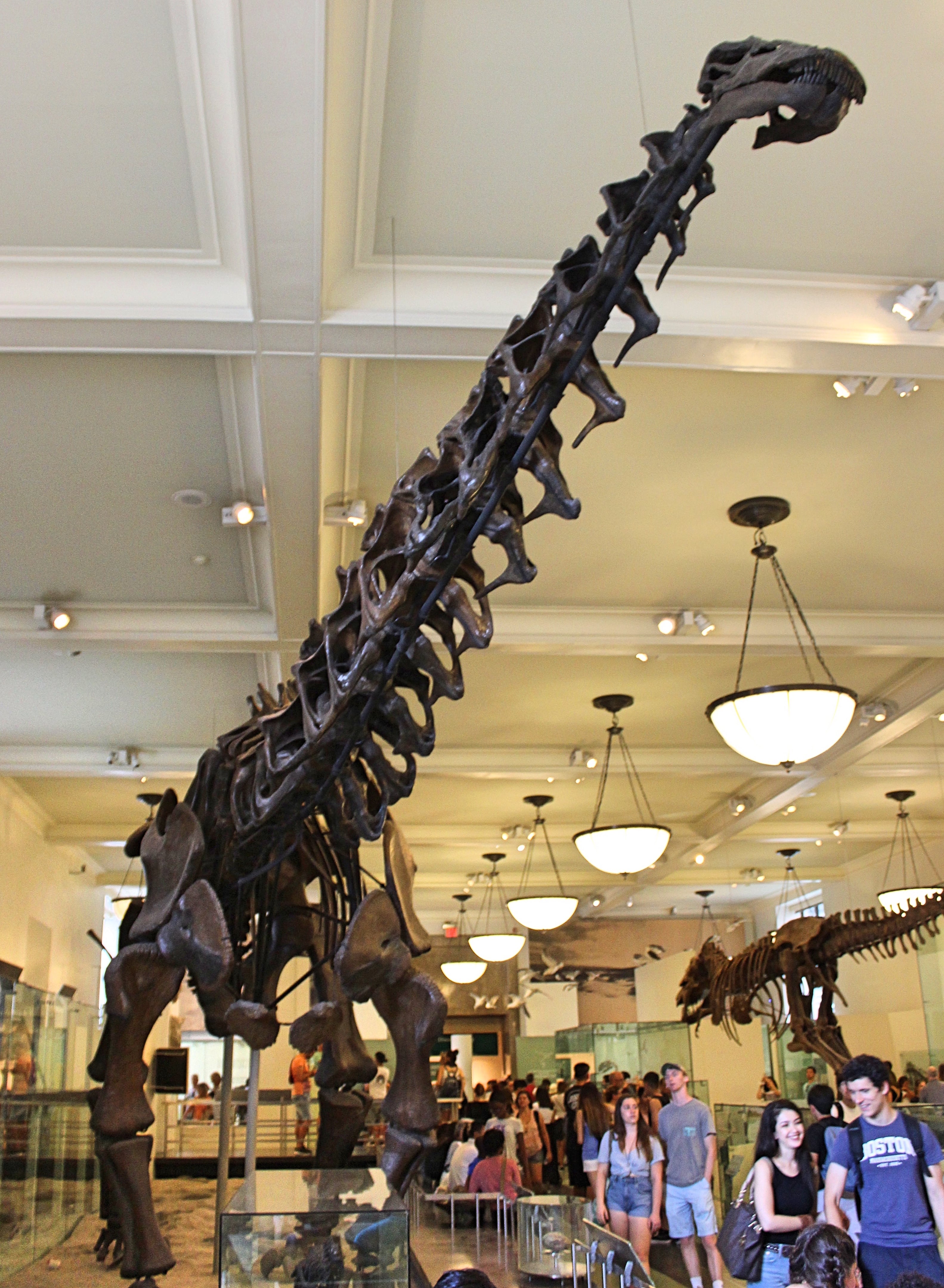 The proper place to begin is on the Orientation Hall. Here the visitor can see a video that explains some background of evolution and cladistics (making evolutionary trees). But the visitor will likely have difficulty focusing on this video, since in 2016 the museum added an enormous dinosaur to the room. This is the Titanosaur, a massive, long-necked sauropod whose form dominates the space. From tail to head, the animal stretches 119 feet (or 32 meters); and in life it likely weighed well over 60 tons (an adult elephant, by comparison, weighs about one-tenth as much). The size of these animals is simply staggering—especially considering that they began life in an egg scarcely bigger than that of an ostrich. How much vegetation did one of these have to eat in a day in order to survive?