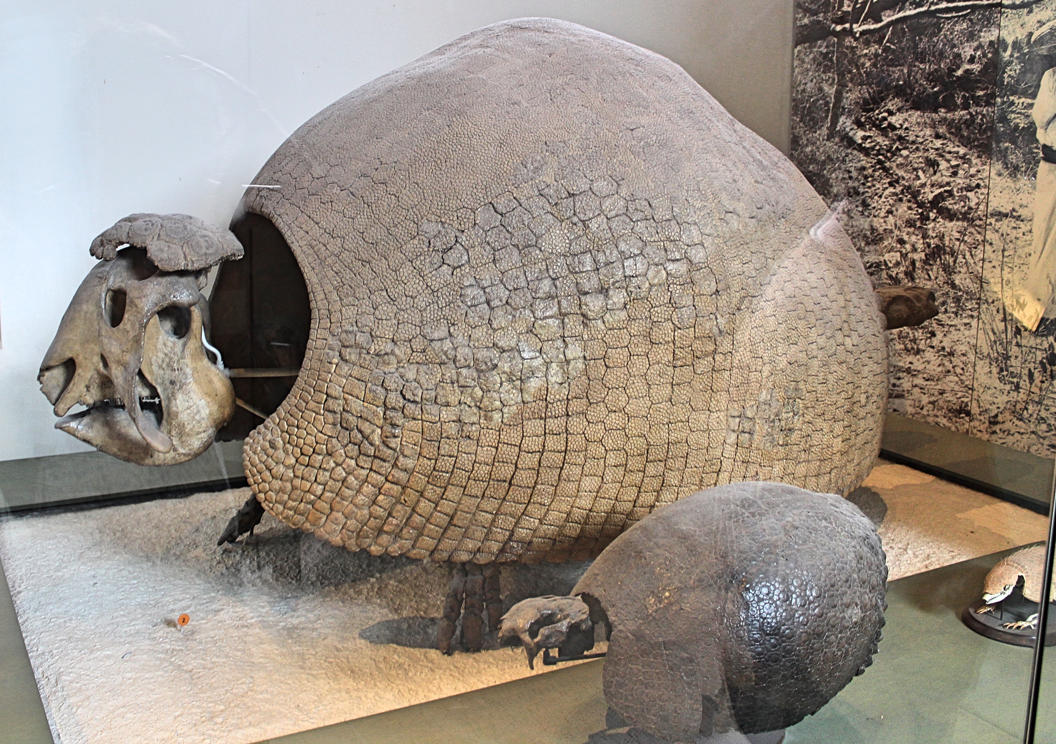 The Hall of Primitive Mammals is notable for the mammal island—a large array of fossil specimens that illustrate the range of mammalian diversity. By any measure, we mammals are an immensely diverse lot, having populated the land, sea, and air, occupying all sorts of niches, and ranging in size from a large insect (the smallest bat) to the biggest animal ever to exist (the blue whale). Amid this sea of variety we find the Glyptodont, an extinct relative of the armadillo, far larger and far more heavily armored. The face of this fossil preserves a sense of the patient drudgery which must have characterized this poor beast’s life, as it dragged its heavy shell through the landscape. The saber-toothed cat led a more exciting, if not more successful, life thousands of years ago, as did the lumbering cave bear. But the most terrifying skeleton of all may belong to the Lestodon, an enormous ground sloth whose gaping nose socket seems to look at you like a cyclops.