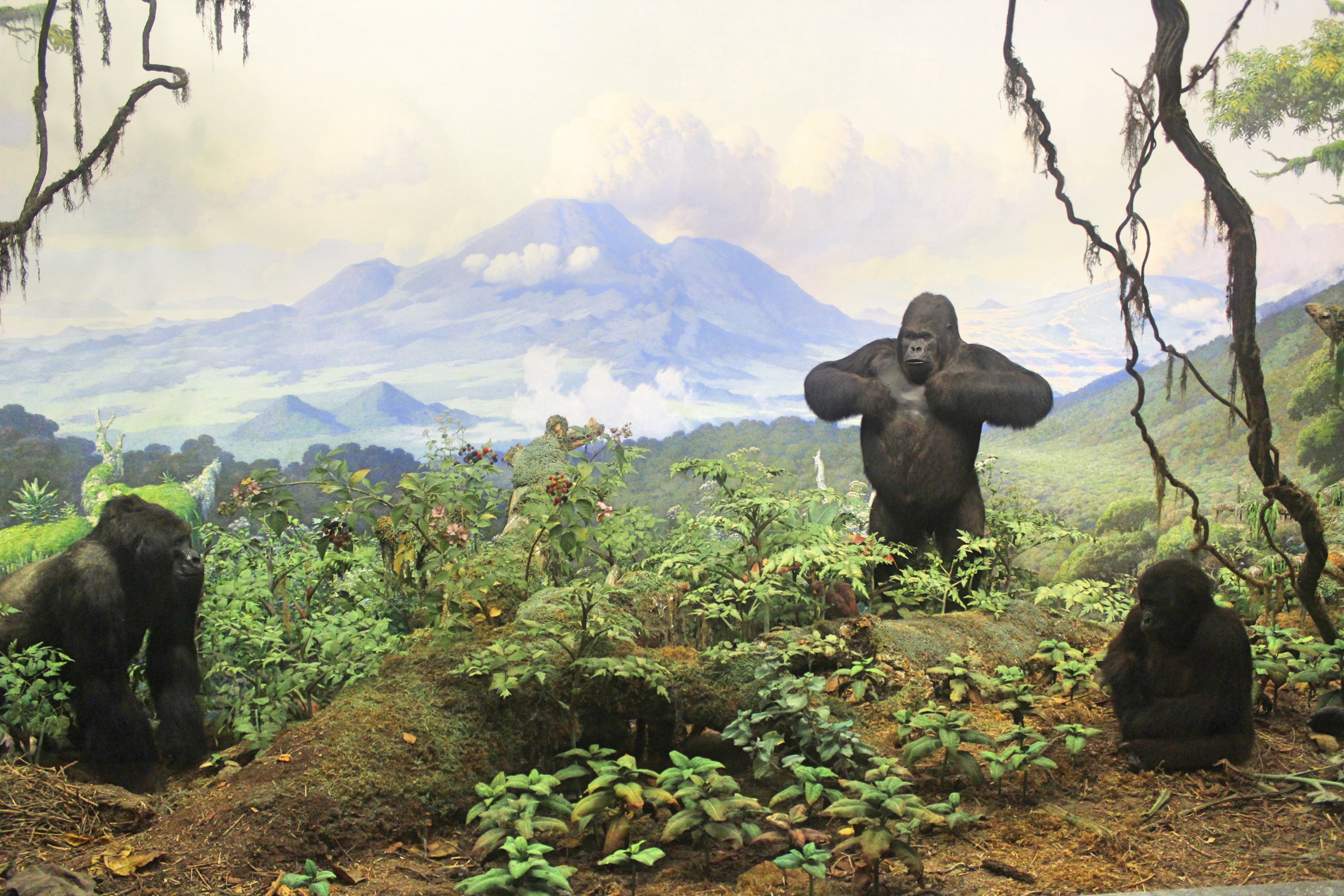 Let us go on straight ahead from the Roosevelt Rotunda into the Hall of African Mammals. Simply as a work of art, this is one of the high points of the museum. In the center a herd of eight African elephants—bulls, cows, and calves—huddle together. Arranged around this heard, in little niches in the walls, are other exotic animals: lions, zebras, giraffes. The visitor would be forgiven for thinking that all of these were merely plastic replicas; but they are real taxidermied specimens of animals (one of the elephants was shot by Theodore Roosevelt himself). This gives the dioramas a kind of macabre air, which is combined with melancholy when examining endangered species such as the rhinos and the gorillas.