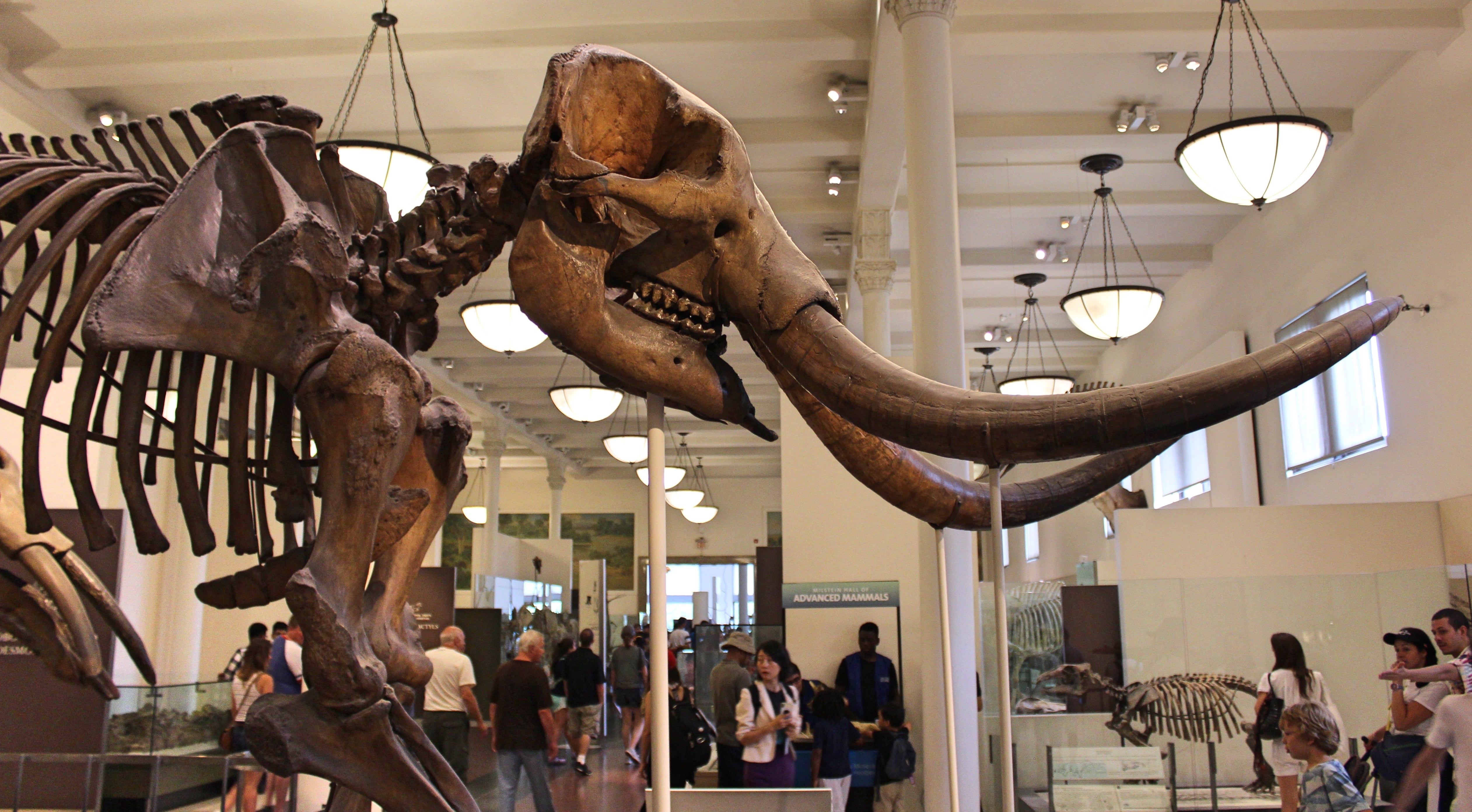 Finally we come to the Hall of Advanced Mammals, which features species more recently extinct (many of which died off during the great megafauna extinction 10,000 years ago). Here we can see a large array of specimens that illustrate the evolution of horses, growing up from dainty things the size of dogs up into the stallions of today (though, as often happens with evolution, this progress was not always linear). At the end of the hall we see extinct relatives of the elephant. One is the mastodon, which is about the size and build of a modern elephant, if slightly stockier. This nearly complete fossil skeleton was found in New York—amazing to consider.