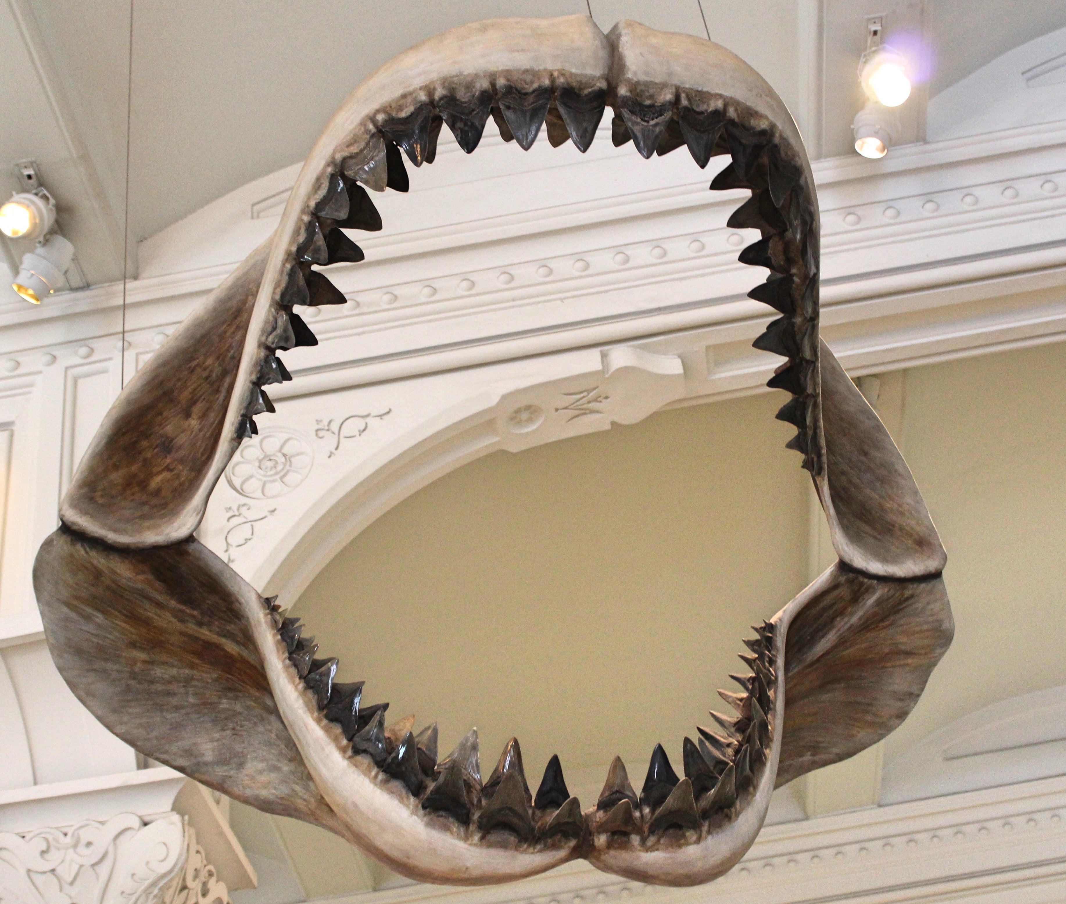 From the perspective of biology, the Hall of Vertebrate Origins is likely the most fascinating hall of fossils, even if it lacks any of the spectacular specimens of later eons. We can see examples of the first vertebrates, on sea, on land, and in the air. One of the more memorable fossils on display are the jaws of the extinct Megalodon, a shark that lived millions of years ago, and which grew several times larger than today’s great white shark. The tremendous and terrifying jaws, hanging from the ceiling, dwarf even the bite of a Tyrannosaur. Nearby hangs a model of the Dunkleosteus, an armored fish that lived many hundreds of millions of years before the Megalodon, and which likely was major predator of its day. Further on is a Pterosaur, a member of the first known vertebrates to have achieved flight. (Commonly called dinosaurs, the Pterosaurs were closely related but technically not dinosaurs. Also, the term “Pterodactyl” only refers to one subgroup of the Pterosaurs.)