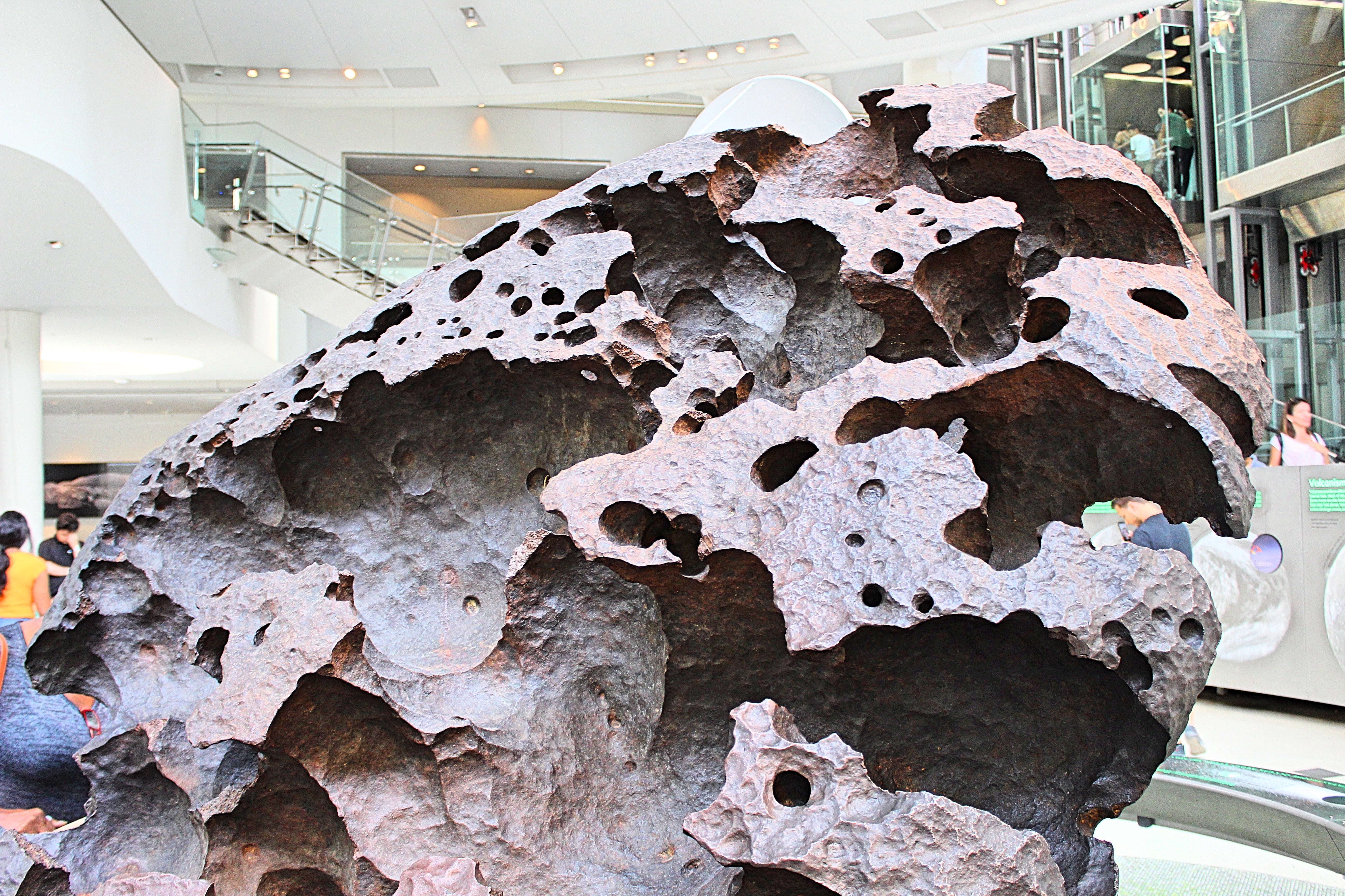 The star of the hall is the Willamette Meteorite. This is another iron meteorite, yet it looks strikingly different from the Cape York Meteorite. Its surface is pockmarked—I believe from centuries of weather erosion. The rock has been on earth a long time. Possibly the core of an early proto-planet, smashed to smithereens in a cosmic collision, this meteorite struck earth thousands of years ago (but we have yet to be able to find the impact sight). It was found in Oregon, but it was likely moved by expanding and receding glaciers. As with the Cape York Meteorite, the Willamette Meteorite was taken without the consent of the native peoples who had long known about it. This led to a lawsuit, in 1999, by the Confederated Tribes of the Grand Ronde Community of Oregon, demanding the return of the rock (which had been in the museum for nearly 100 years by then). Luckily, the AMNH reached a deal that allowed it to keep the meteorite.