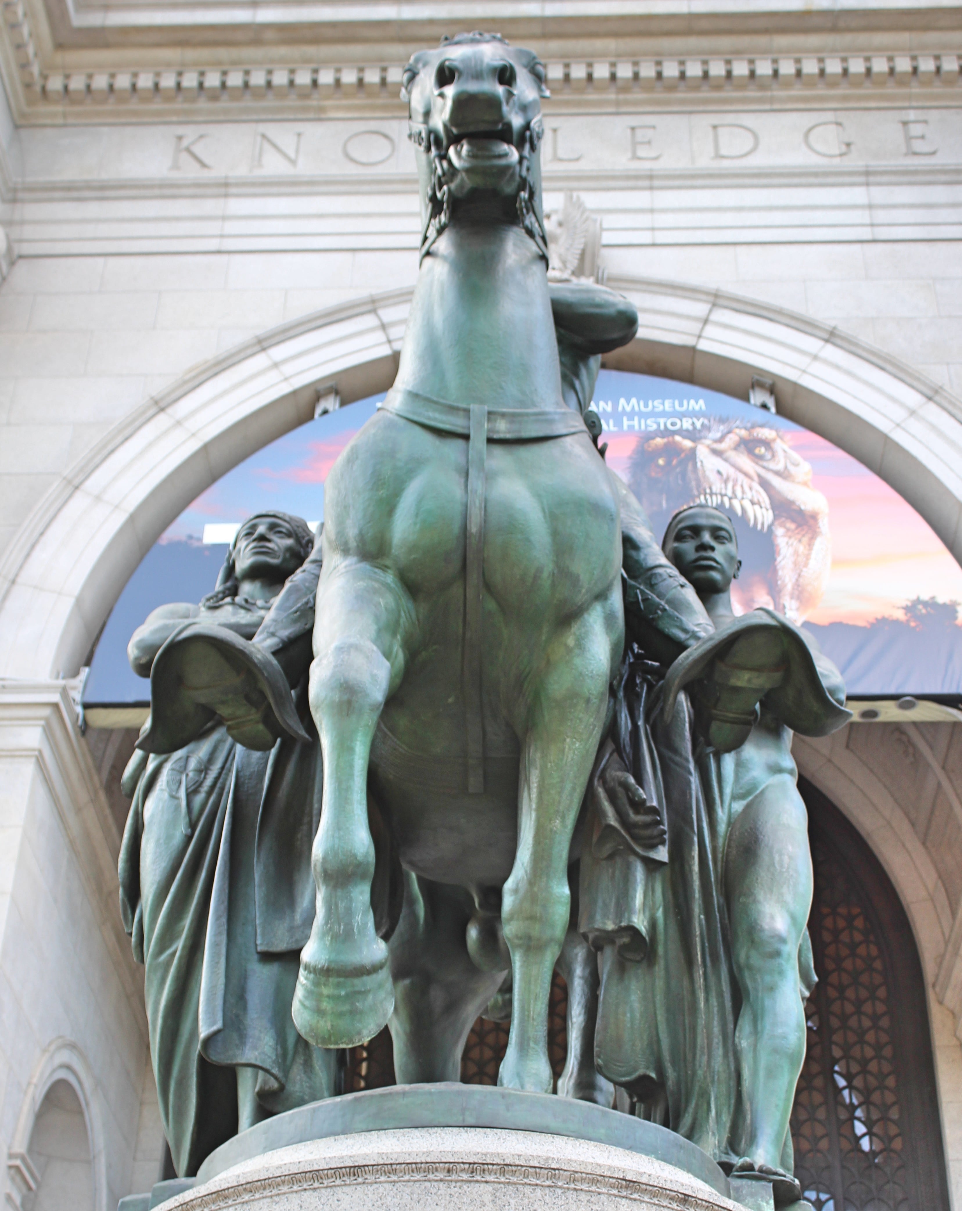 You can enter the museum from several spots. The grandest is, without a doubt, through the Roosevelt Rotunda on Central Park West. When walking up the stairs, the visitor will notice the heroic equestrian statue of President Theodore Roosevelt. It is worth pausing to continue this statue, for it encapsulates much of the controversial history of the institution. The mustachioed man is flanked by a Native American and an African man, both on foot, and both looking rather dejected to my eyes. The racial message is clear: the white man sits atop the lesser races. To its credit, the AMNH is acknowledging this imagery with a special exhibit, “Addressing the Statue.” I think this strategy is far preferable to the idea of simply removing it, since now the statue provides an opportunity for learning.