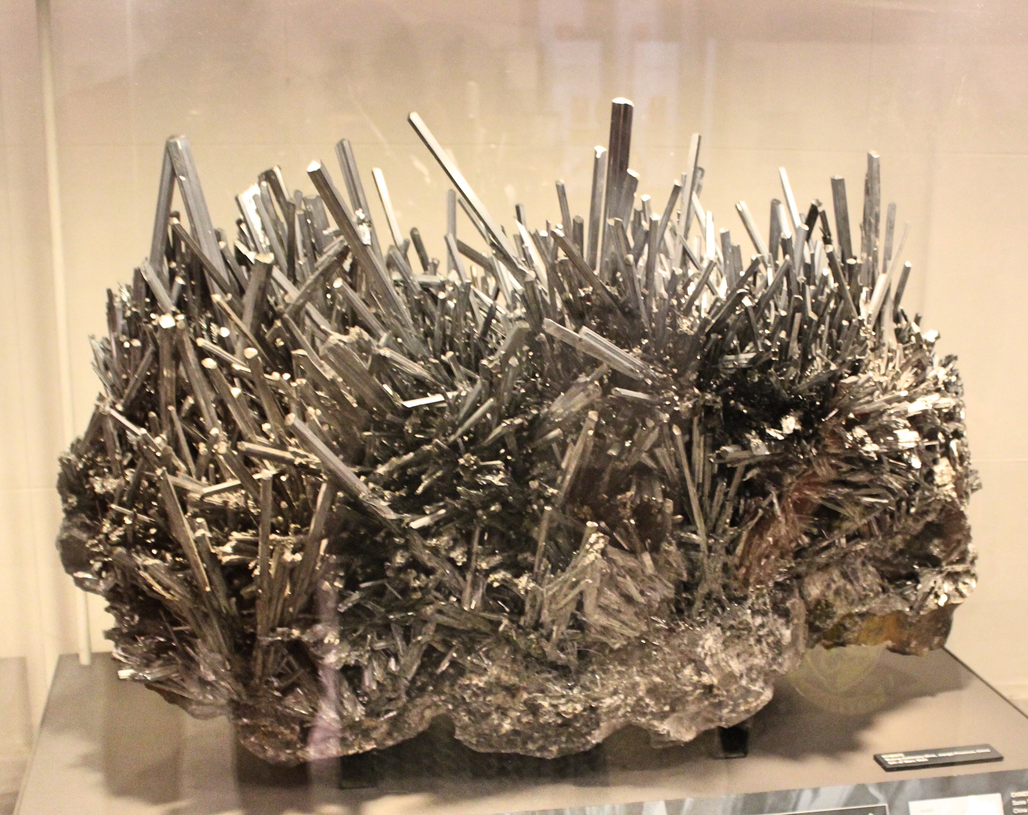 There are still other treasures to be found in this gallery. In one corner is a glass containing an ammonite fossil. This are extinct mollusks which looked like squids living in a spiral shell. This particular ammonite happened to fossilize under high pressure, which resulted in it being an iridescent rainbow. Nearby is a magnificent stibnite: a metallic crystal formed from antimony and sulfur. These crystals form themselves into a collection of jagged silver spikes all sprouting from a central core. A nearby child compared it to a porcupine.