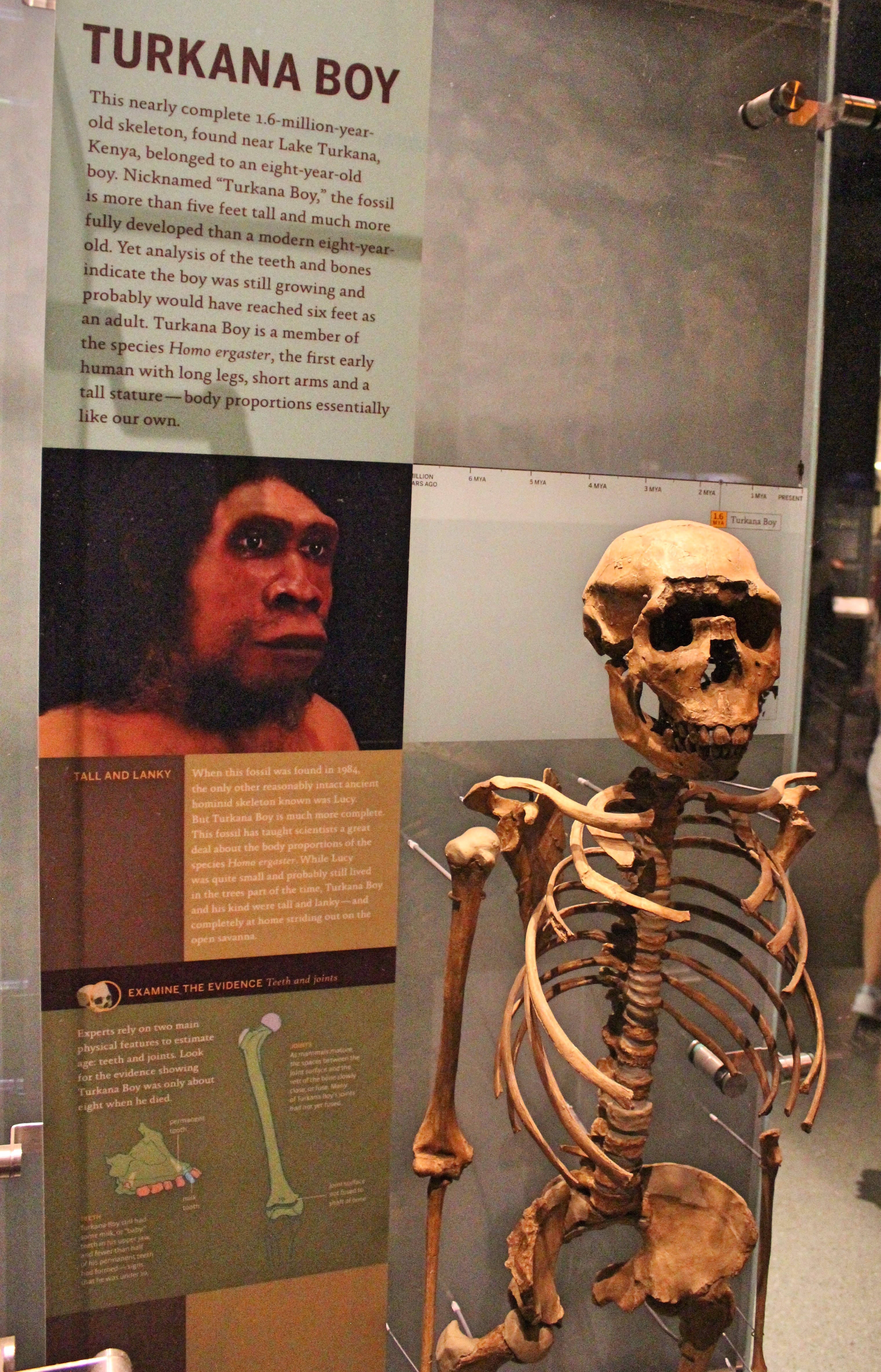 A major highlight are casts of famous human ancestor fossils, including Turkana Boy and Lucy. (I myself studied human evolution in the Turkana Basin, so it is always gratifying to see the plaque about the region.) There is also a reproduction of the Laetoli Footprints—imprints preserved in volcanic ash 3.5 million years ago, showing clear evidence of bipedalism—and a diorama of the what the two australopithecus may have looked like as they walked across the ashy plain (the male with his arm snuggly around his mate). There are also scenes representing the life of early humans, building shelters out of mammoth bones or being ambushed by giant hyenas. It was a tough life back in the paleolithic.