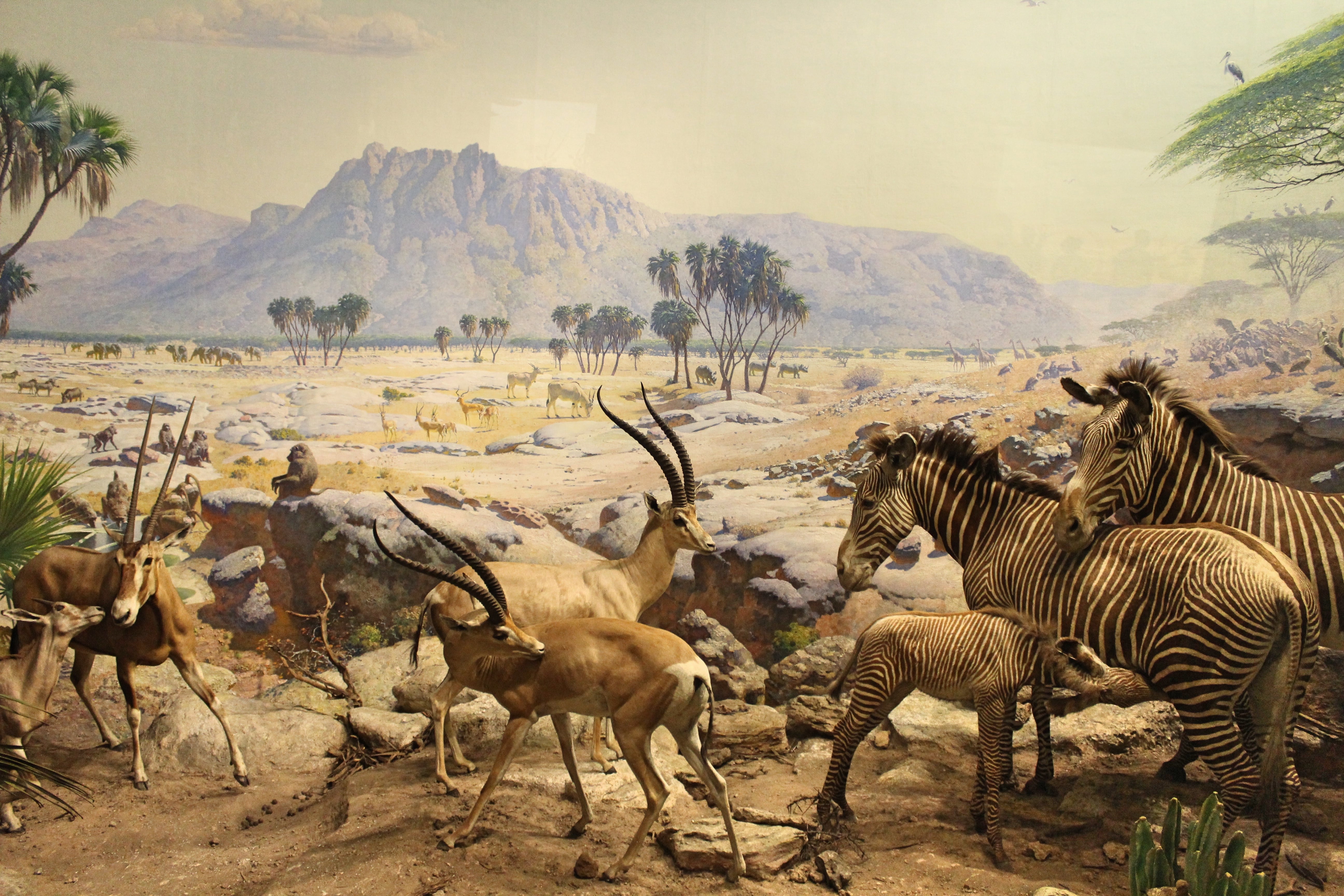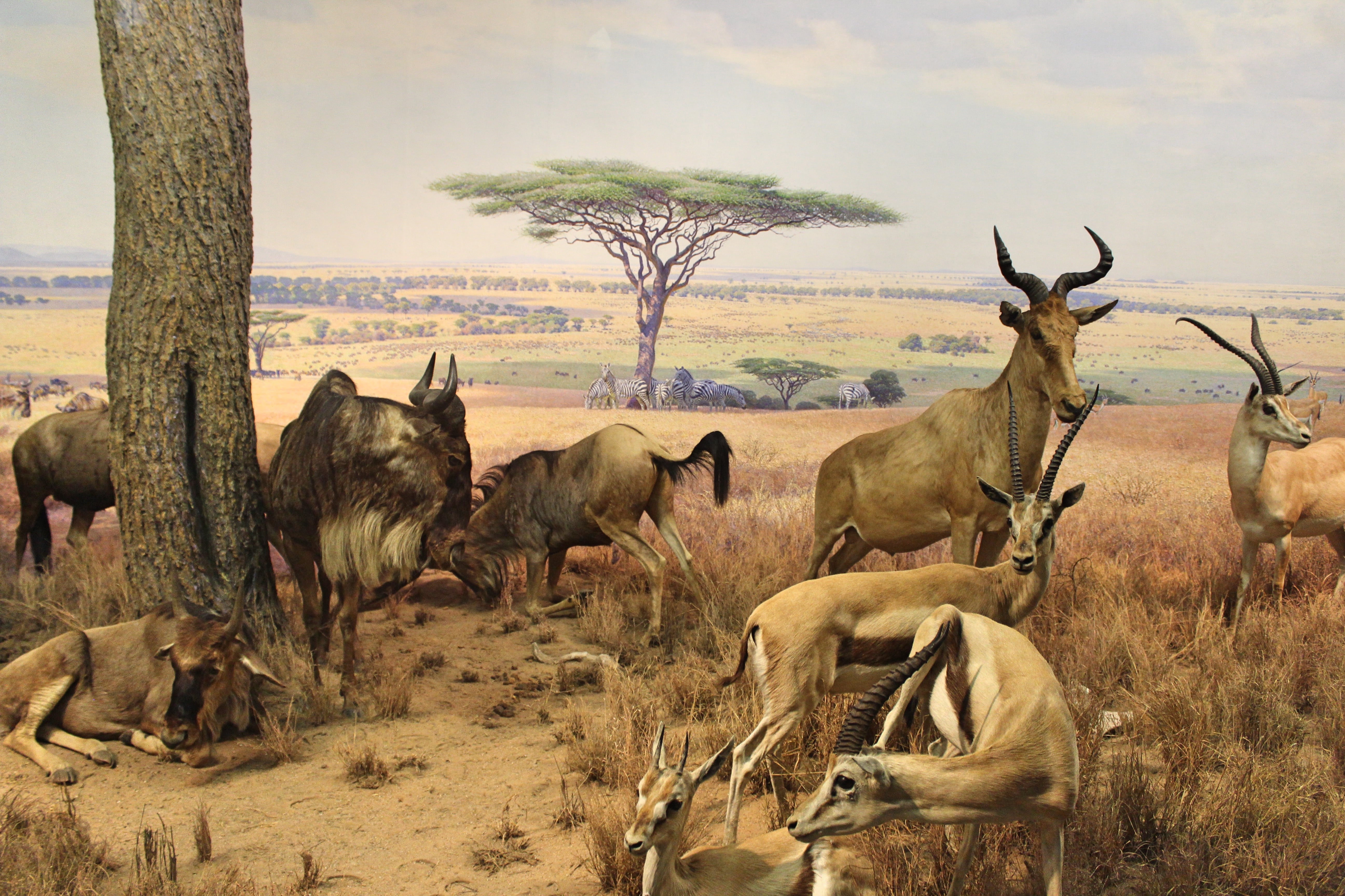 Yet art intervenes to uplift this collection of exotic bodies into a thrilling exhibit. Every diorama is masterfully done: the animals stand in dramatic, lifelike poses amid an environment so scrupulously recreated as to be totally convincing. Added to this are the paintings on the curved surfaces enclosing the dioramas. These hand-painted backgrounds are worthy works of art in their own right: adapting perspective to the wall’s curvature in order to create a nearly seamless continuation with the scene in the foreground. The result is a strange blend of natural beauty and human invention, which is at turns convincingly lifelike and technically astounding. As I walked along from diorama to diorama, I felt like pilgrim visiting a church, walking around from chapel to chapel.