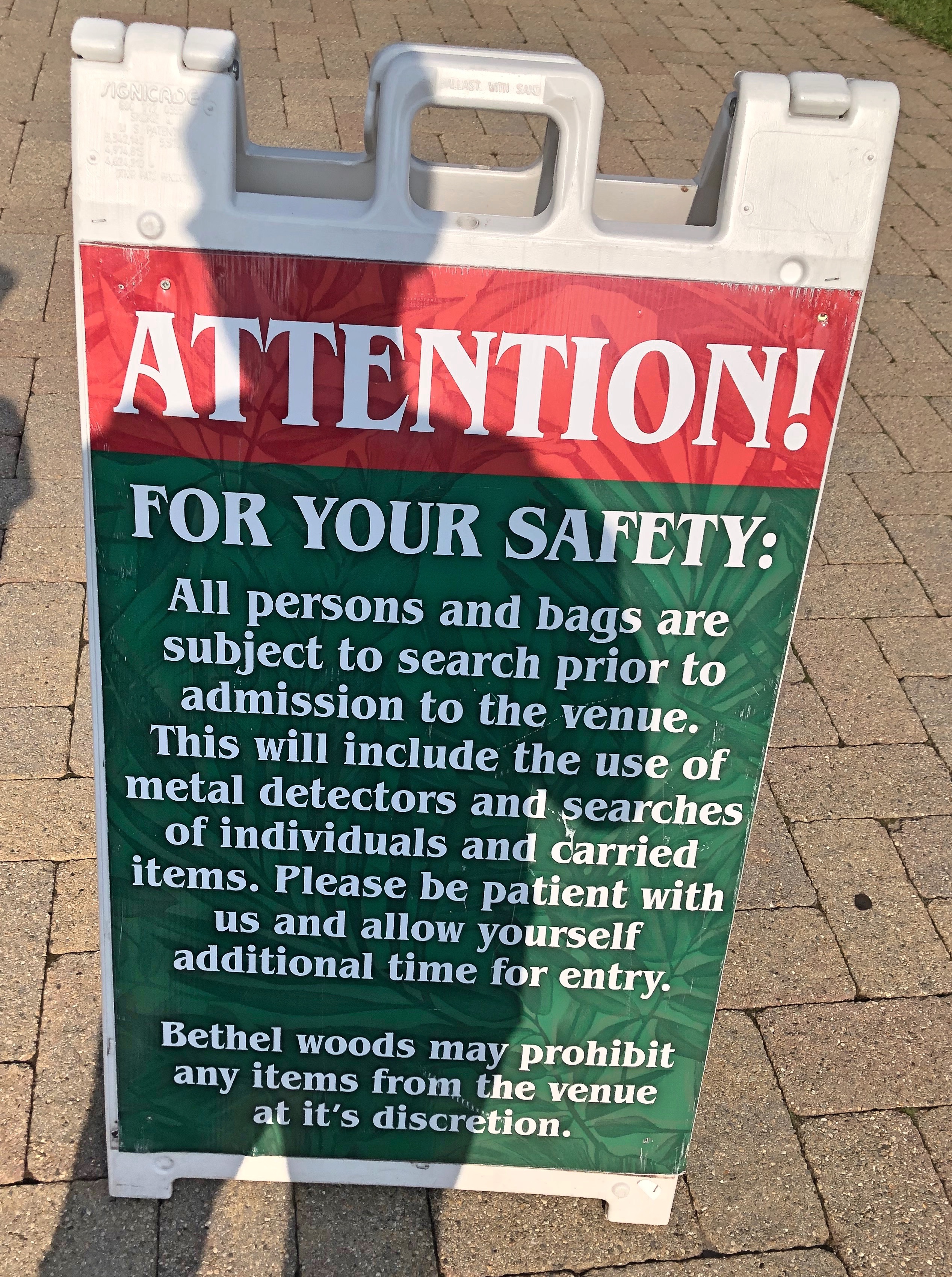 This done, we circled back and were finally allowed into the parking lot, being waved on by dozens of attendants. The walk to the venue took us past a great many signs, each one adding to the ever-increasing list of prohibited items and activities. No weapons, of course, or “any object that may be used as a projectile” (quite a broad category), nor professional cameras, posters, banners, selfie sticks, iPads, or lawn chairs. If you wanted to bring a camera, it could not have an interchangeable lens. If you wanted to bring a bag, it had to be plastic and transparent, allowing the staff to easily see what was inside. Among the list of permitted items were umbrellas, strollers, and “two 20oz. factory sealed bottles of water per person.” On the list of prohibited items were musical instruments.