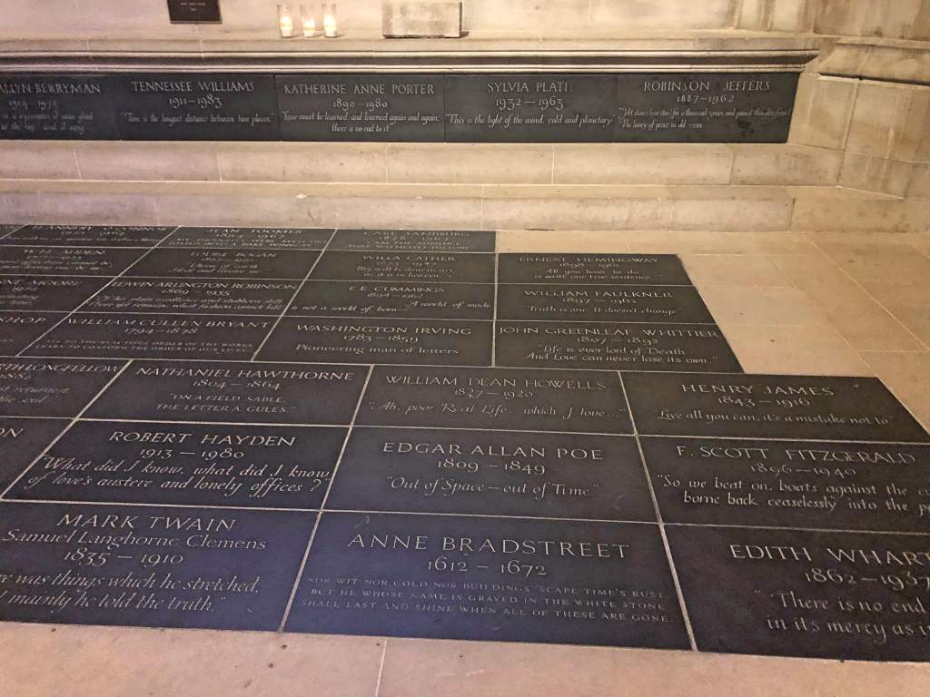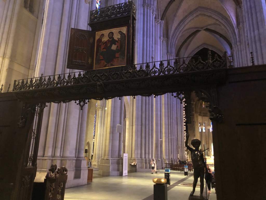 The inside is fully in keeping with this aesthetic. Enormous pillars hold up a vaulted ceiling, while stained glass windows allow colored light to drift inside. The visitor is greeted by a beautifully carved wooden choirstall, holding an image of Christ against a golden background. (This is a real 15th century German work, on loan from the Metropolitan.) The cathedral even has a sort of poor man’s version of the Poet’s Corner in Westminster Abbey. As far as I know, there are no actual poets buried in this section of the church; instead, small tablets bearing the names and brief quotes of famous American authors cover the floor. According to the plaque, the idea was inspired by a rector in the church of Washington Irving in my hometown, Tarrytown.