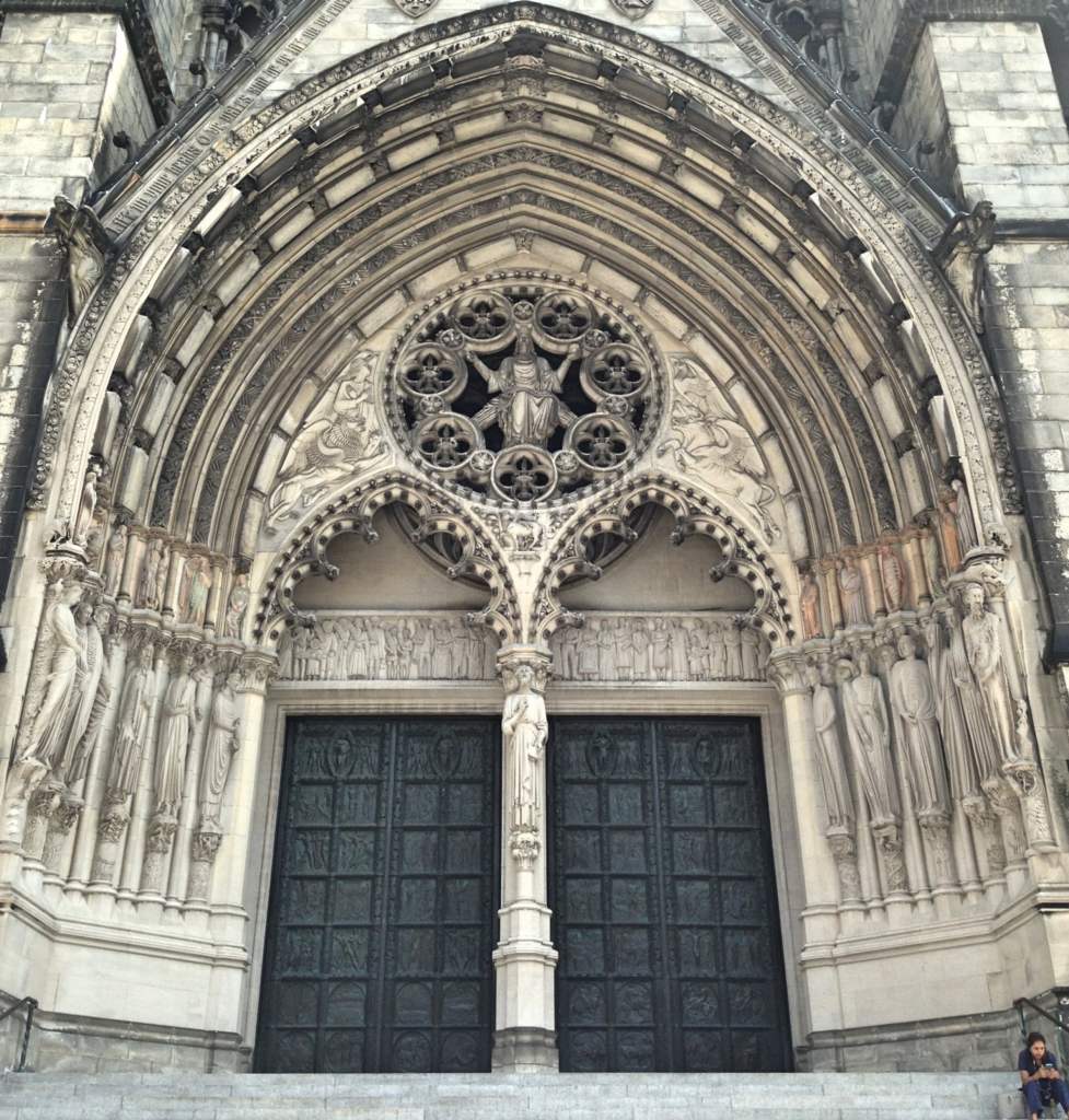 Even with all of these parts missing, however, it is a giant church. Not to be outdone by the Catholics, the Epicopalians conceived the project as a way to rival or even surpass St. Patrick’s. This cathedral, too, is built in an elaborate neo-gothic style that mimics the great cathedrals of France and Spain. Its hulking façade, with its three enormous doors sitting underneath pointed arches, beckons the visitor from the streets of modern Manhattan to a seemingly medieval world. All of the decorations carefully maintain this illusion, from the frilly spires, to the ornamental carvings, to the friezes of Biblical scenes above the doors. Even the monumental brass doors are covered in art, showing scenes from the life of Christ and representations of the four evangelists. Aside from the cathedral’s manifestly incomplete state, the only thing that breaks the illusion is the appearance of grey discoloration from car exhaust.