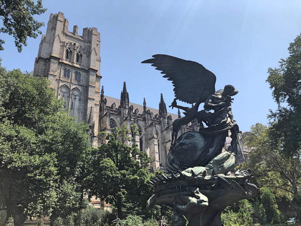 Adjacent to the building is an attractive little green space, known as the West 111th Street People’s Garden. Here is located the building of the Cathedral School, a K–8 school for children of any faith; and during the summer it is common to see flocks of children in summer camp parading by. Nearby is the Peace Fountain, a sculpture by Greg Wyatt supposedly portraying the battle between the Archangel Michael and Satan, and the triumph of good over evil. Yet to me the statue looks like an angel strangling a curious giraffe. In any case, the odd sculpture provides a nice illustration of the cathedral’s less orthodox attitude towards traditional themes.