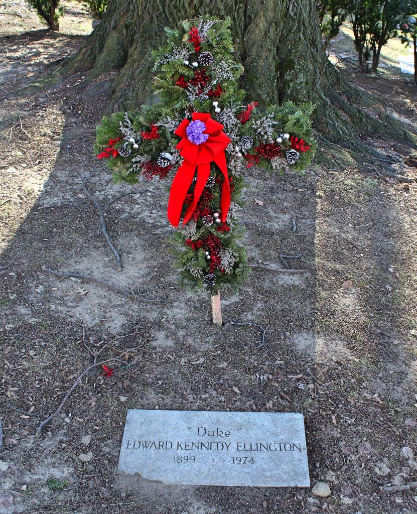 It would be hard to name a musician so influential in the history of jazz. Yet there is one buried right next to Davis: the Edward Kennedy Ellington, better known as “Duke” (1899 – 1974). Ellington has a claim to being the supreme composer of jazz tunes—many of which have become standards in the repertoire—and, indeed, I think he can be justly considered one of the master composers in any genre of the last century, for his music went far beyond the conventional boundaries. His grave is a small plaque in the ground, set before a large tree and flanked by two stone crosses.