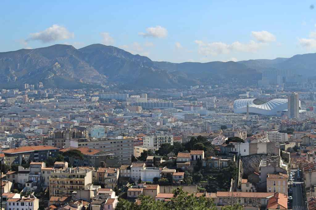 On the opposite side of the basilica, you can see the white folded shape of the city’s football stadium, the Vélodrome; and beyond that, you can see the monumental conglomeration of apartment buildings, La Rouvière, which seem to be as much part of the landscape as the mountains.