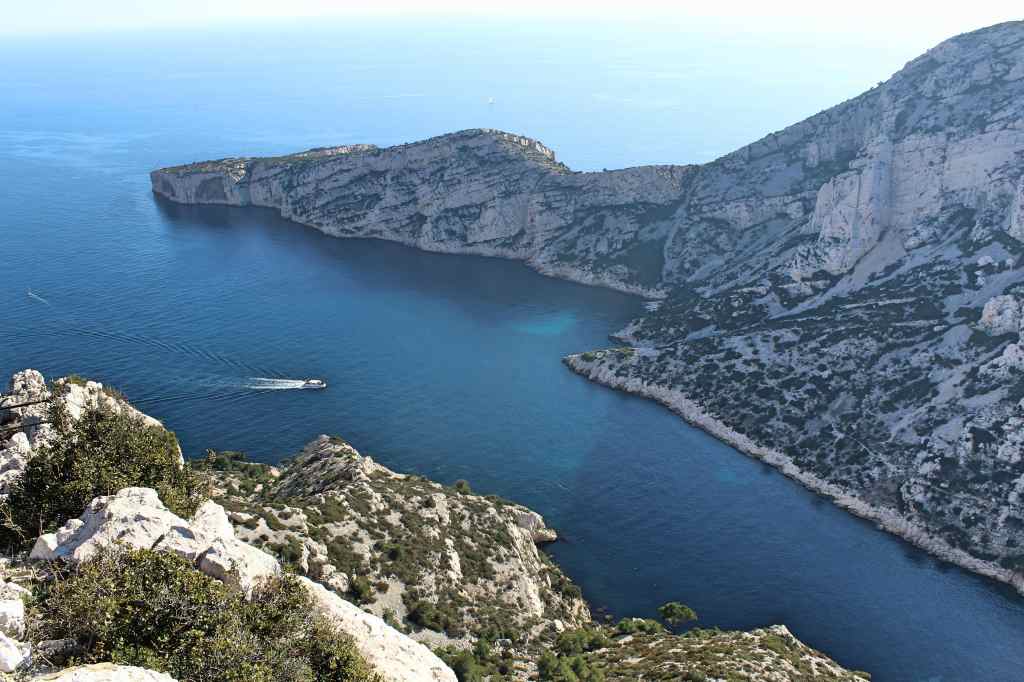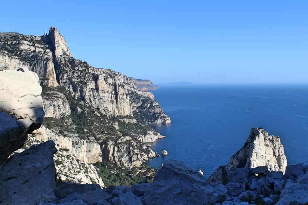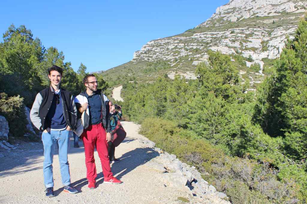 The repast done, we then boarded a city bus that carried us beyond the city limits. We were going to visit one of the treasures of the area: Calanques National Park. At first I did not know what the fuss was about. The bus left us near a trail, leading us into an entirely typical Mediterranean landscape: with dry, sandy soil, diminutive pine trees, and sun-baked rocks. Indeed, the area was strangely reminiscent of hiking trails in the Guadarrama mountains of Madrid. We carried on walking, pausing occasionally on the wooden benches, smelling some of the wild rosemary growing along the path, until we reached the coast.