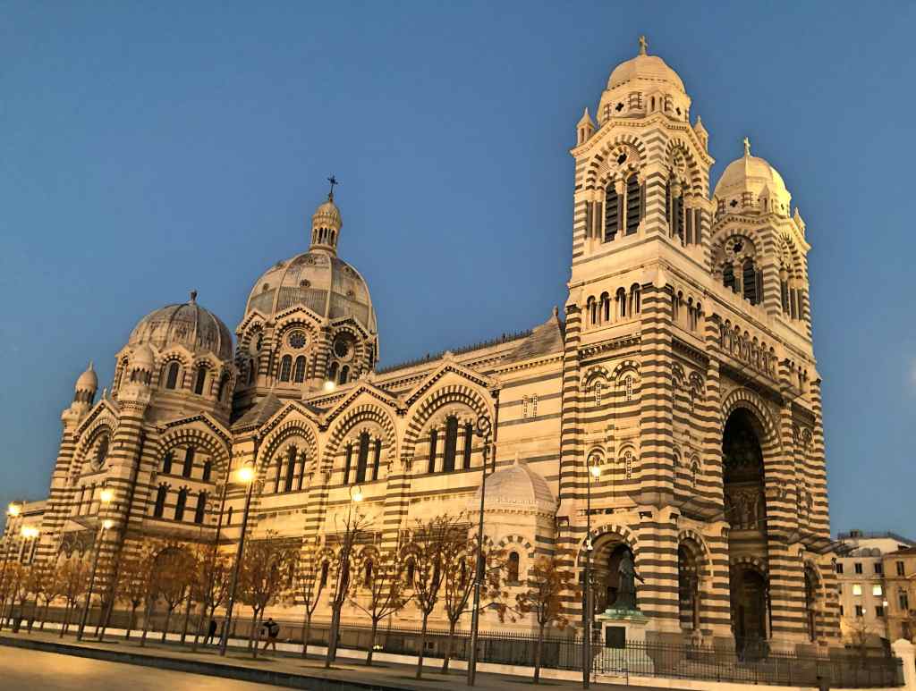 Evening was fast approaching, so it was time to head into the center of town. In Marseille, this almost inevitably means walking towards the water. We followed the gently sloping ground down to the city’s cathedral, which sits within a few hundred feet of the sea. It looked quite lovely in the waning daylight. Of relatively recent construction (for Europe), the cathedral was made in a Byzantine-revival style, with ample domes and circular arches—a far cry from the angular French gothic. The alternating horizontal bands of dark and light stone used in the facade give the building a playful charm. (Though I did not see it during my trip, I later learned that the much older, much smaller original cathedral can still be seen beside the modern building.)