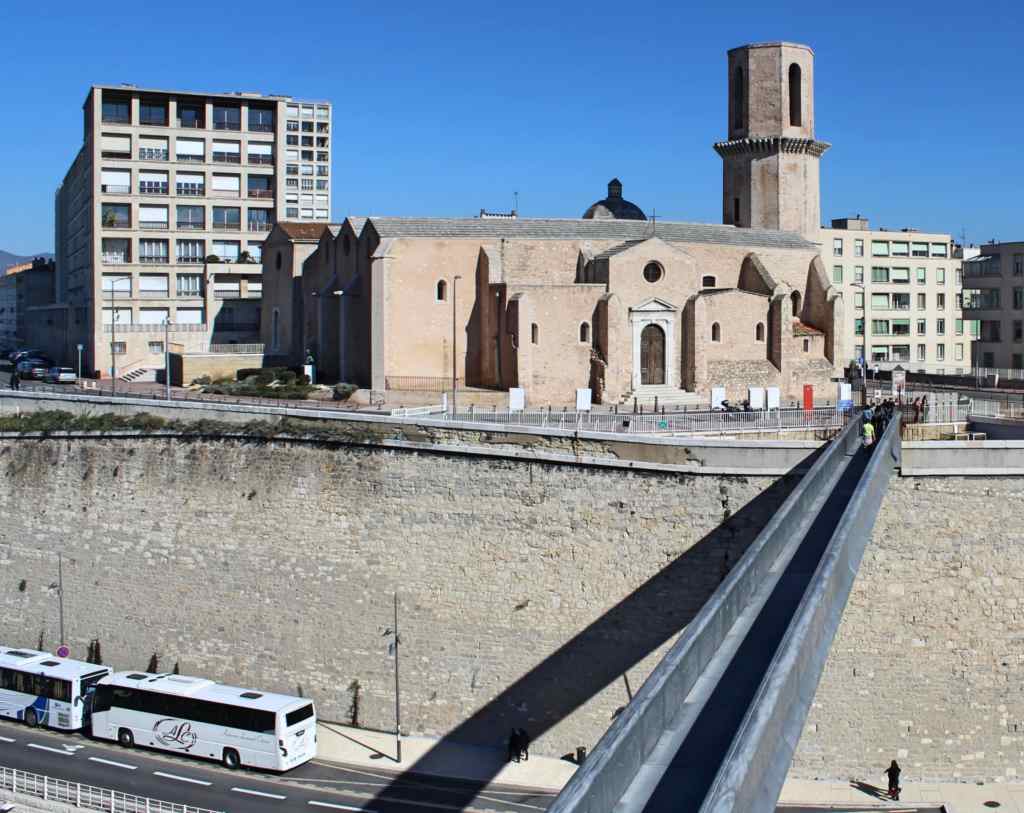 The visitor can walk directly from the roof of the museum to the neighboring castle, Fort Saint-Jean, via an elevated walkway. This is yet another fortress in the arsenal of Marseille, built during the reign of the Sun King, Louis XIV. The old turrets provide an attractive view of the Old Port, and many parts of the fortification are now occupied by lovely planned gardens. Across another elevated walkway there is the church of Saint-Laurence de Marseille, a lovely old Romanesque church. From there, the old port (le vieux port) is just a short walk away.