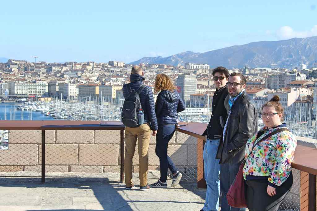 After partaking of the spectacle—and a quick coffee in the café next door—we went back down the hill and returned to the port. There, we visited the Mucem, short for the Musée des Civilisations de l’Europe et de la Méditerranée, which was opened in 2013 when Marseille was dubbed a European Capital of Culture for that year. We did not visit the exhibitions, however, as we were short on time, and Greg assured us that they were not spectacular in any case. Instead, we headed up to the roof, to enjoy another coffee in the modernistic museum building. The outside of the entire structure is covered in a kind of grey, plastic web, like artificial seaweed, which certainly stands out among the sandy-colored stone that makes up the surrounding area.