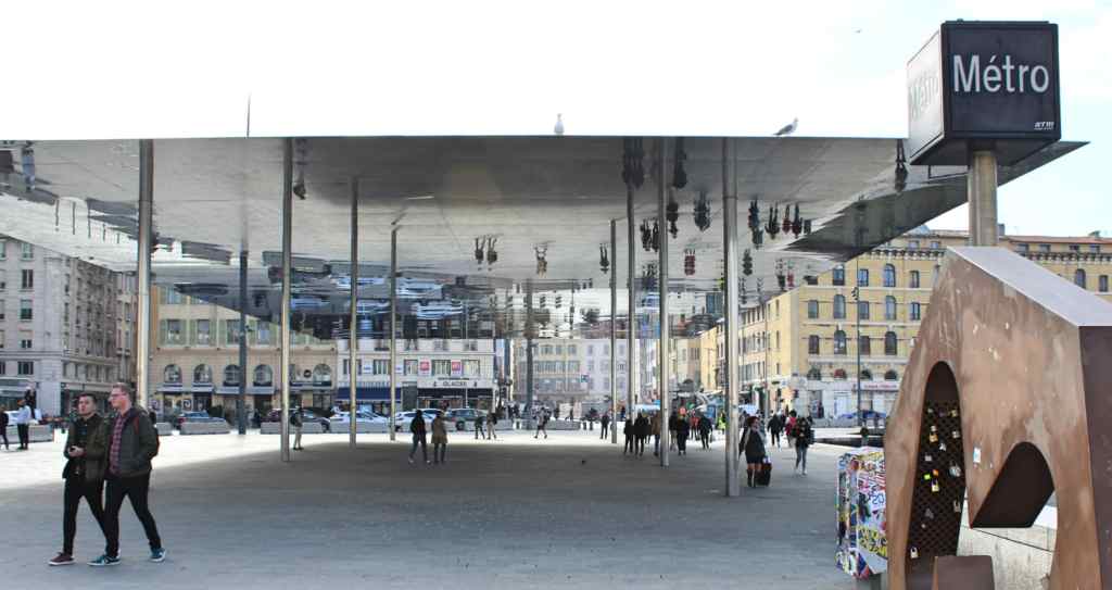 Right next to this little market is a bit of public art, the Ombrière. Like the museum, this is yet another relic of the 2013 European Cultural Capital Celebration—a design by big-time architect Norman Foster. The Ombrière is an elevated roof whose underside is an enormous mirror. This makes for good fun as you walk underneath and crane your neck, and it is a gift to amateur photographers. It would be much appreciated in a rainstorm, too.