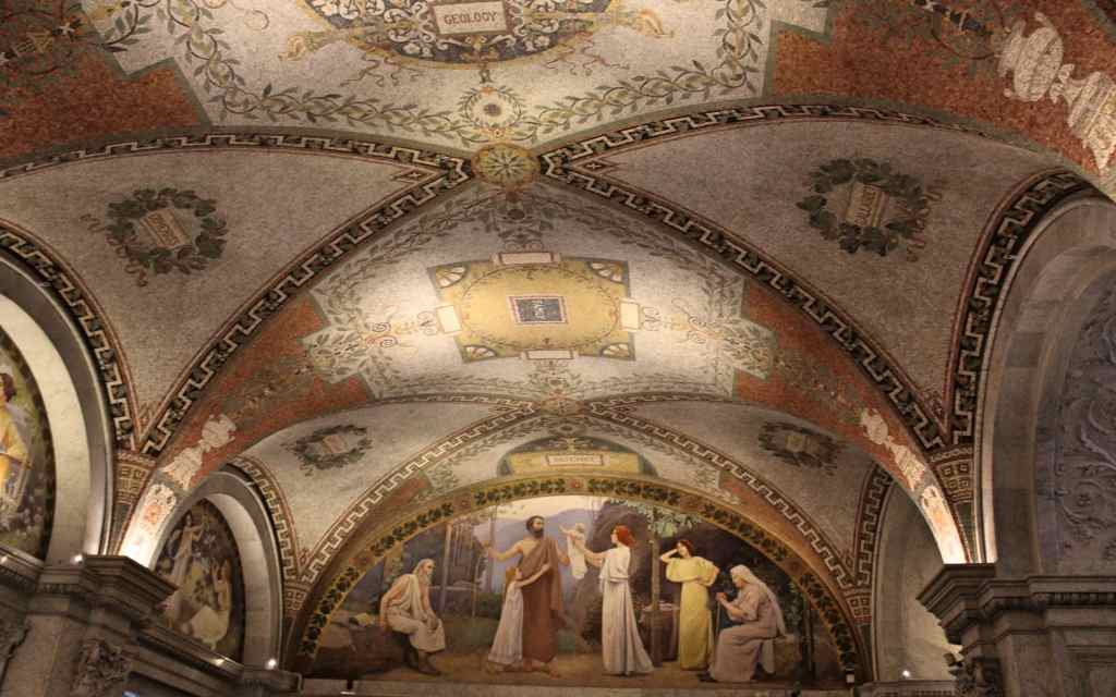 The interior of the building is even more richly decorated than its façade. The Great Hall is covered in an elaborate program of murals, friezes, and sculptures, created by an enormous team of artists. It is a kind of secular cathedral, with personifications of the arts, sciences, and civic life. Little cherubins adorn the grand staircases leading up to the upper deck, while heroic figures in flowing robes masquerade as abstract concepts. The names of great writers—Cervantes, Shakespeare, Milton—with accompanying quotes are worked into the decorative program, preserving something of the taste of Ainsworth Rand Spodoff, who was the Librarian of Congress at the time. All of the decoration, abstract and figurative, is lovely. The room has a light and buzzing energy, not at all oppressive in its finery. The rare books on display complete the impression of a temple of knowledge.