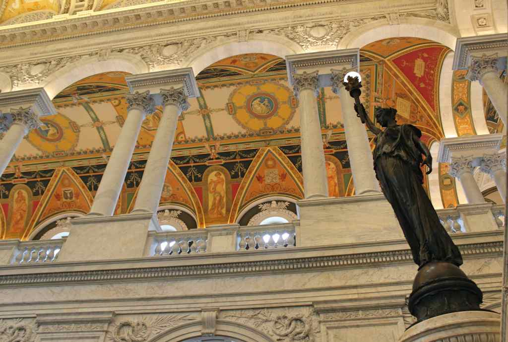 As impressive as all this was, the cold dictates of justice did not touch me so nearly as the warm thrill of literature from right next door: the Thomas Jefferson Building of the Library of Congress. This is but one of three library buildings in the capital, the other two being the John Adams and the James Madison memorial buildings (to deal with the overflowing collection). As an institution, the Library of Congress is impressive. With a collection of over 170 million items, in 470 different languages, the Library of Congress plausibly claims to be the largest in the world. Like any famous library worth the name, it has an ample collection of rare books and manuscripts, including one of the three perfect versions of the Gutenberg Bible still in existence. Thomas Jefferson amply deserves to be the namesake of this library, as he personally sold his collection of 6,487 books to the federal government after the invading British burned the previous collection during the War of 1812. (A subsequent fire unfortunately destroyed many of Jefferson’s books as well.)