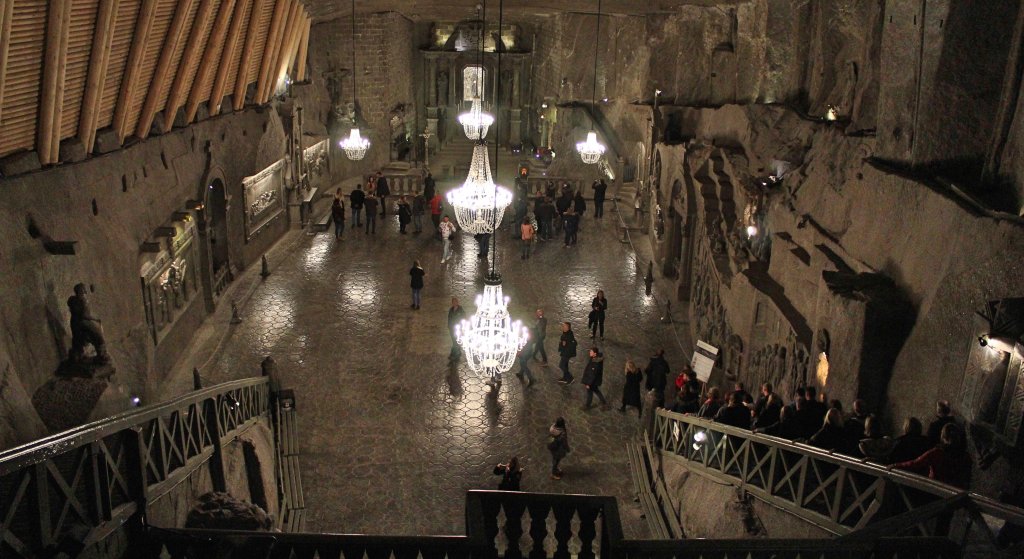 Yet the reason that Wieliczka became so popular is not because tunnels and salt are so fascinating. It is, simply, a beautiful place. Over the years, talented miners have carved works of art into the walls—humorous statues, religious figures, historical personages. There are four entire chapels, one of them as impressive as a cathedral, complete with a chandelier adorned with salt crystals. Another highlight is an underground lake, eerily blue in the artificial light of the cavern, whose water is so saturated with salt that it is probably quite toxic. And then there are the massive scaffolds that seem to go endlessly on into the bowels of the earth.
