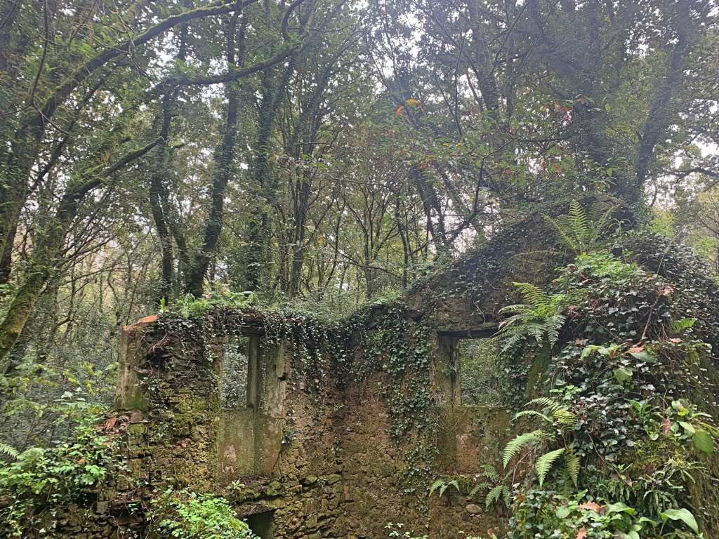 No matter, we had pressing business, and within moments I was back in the car on my way to the next destination. This was probably my favorite thing I saw that day, but I admit I was on guard when my host pulled over by the side of a road and told me to start walking into the forest. My misgiving aside, it was a thoroughly lovely example of a lush Galician forest, with moss-covered trees all around, and the Traba river gurgling nearby. Soon we had arrived at our destination, the abandoned village of Xei. Though the ruins appear absolutely ancient, this village was not abandoned so long ago (less than a century, I think). According to this website, the town was depopulated because its economy relied on the water-powered mills, which became obsolete with the adoption of electricity. In any case, I think ruins often have a strange and otherworldly beauty, and these skeletal structures, green with encroaching forest, were wonderfully evocative.