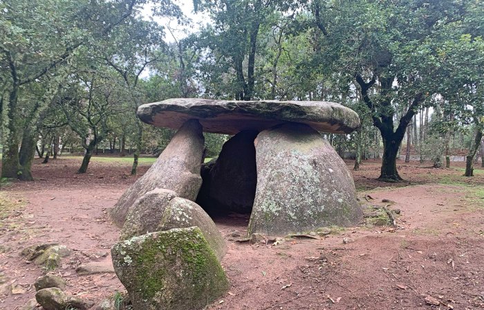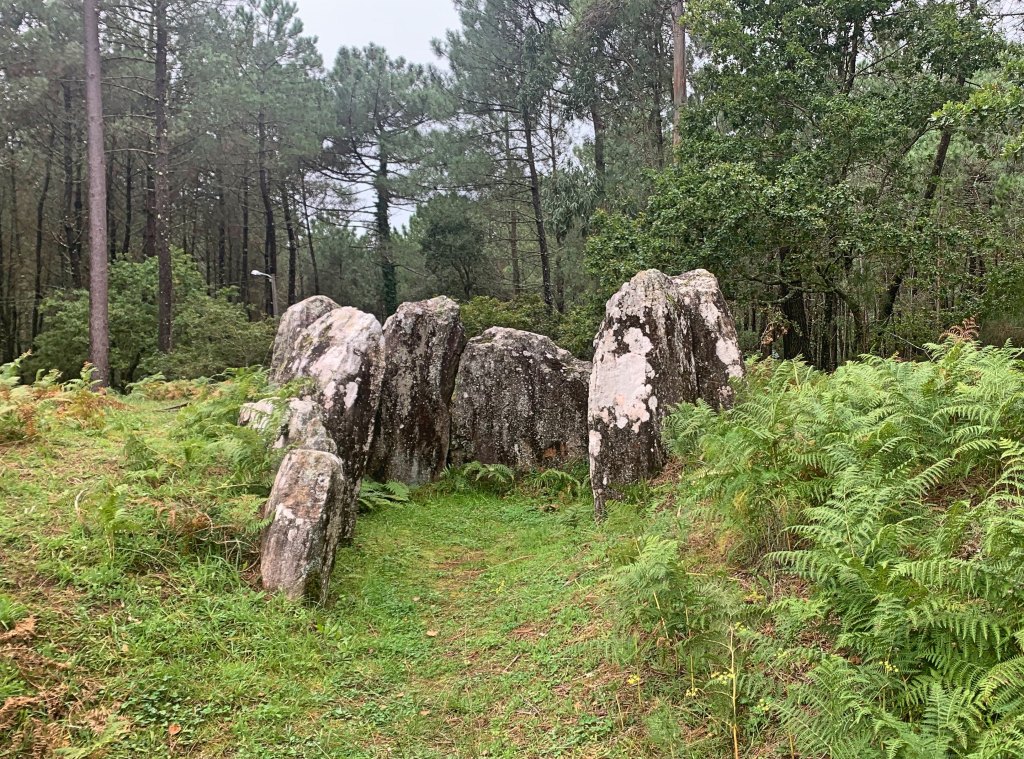 Our next stop was brief, to the nearby Dolmen of Argalo. A dolmen is a kind of megalithic tomb, consisting of a single chamber in a stone structure. In this case, very large slabs of granite were stuck into the ground to form the walls, and dirt was piled up all around it to make a kind of mound. Human remains do not preserve well in the acidic soil, so no bones were found inside. However, archaeologists did uncover stone tools and fragments of ceramics. As my guide remarked, we will never know what the people who built these believed.