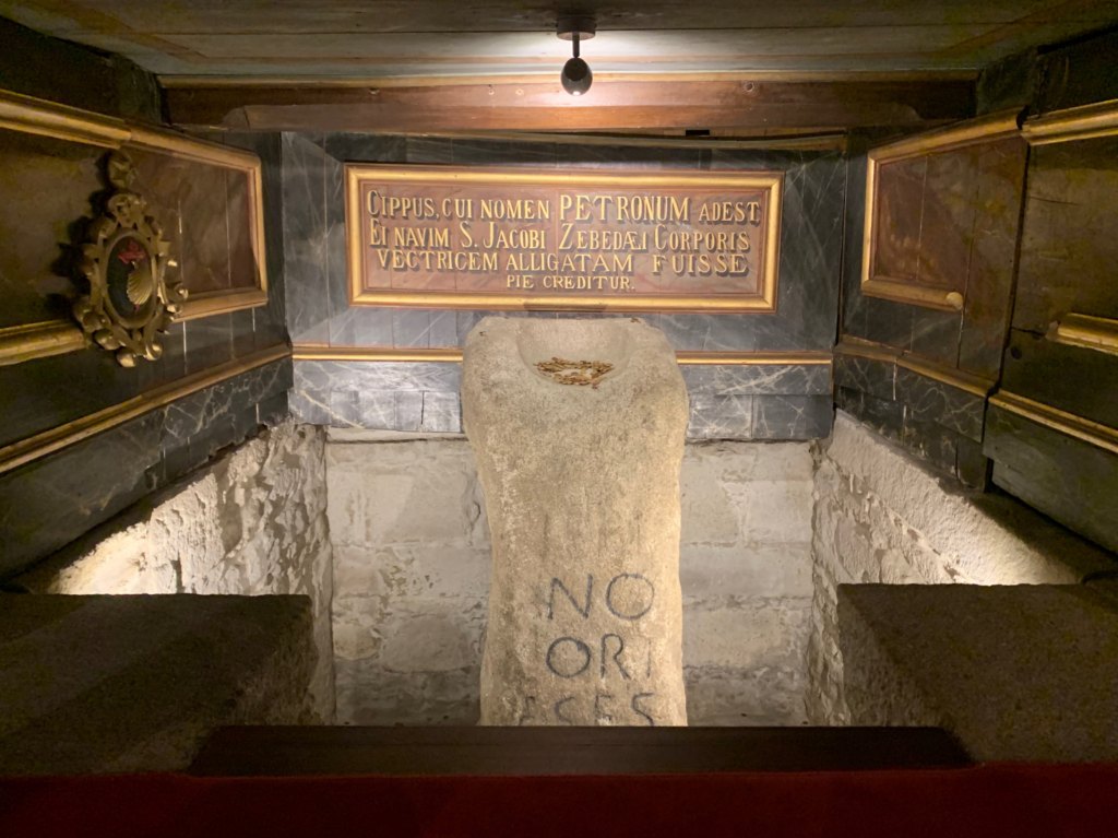 Nearby was the town of Padrón, our next stop. This town will be familiar to lovers of Spanish food, for being the home of the famous pimientos de Padrón—delicious small green peppers that are fried in olive oil and served with rock salt. But my host wanted to show me the Parroquial Church. Again, like many local Spanish churches, it was large and attractive but not memorably so. What sets the church apart is the “pedrón.” This is a sort of large stone that is given pride of place in the church. According to legend, the ship that divinely transported Saint James’ body from Jerusalem to Spain was finally moored to this stone.