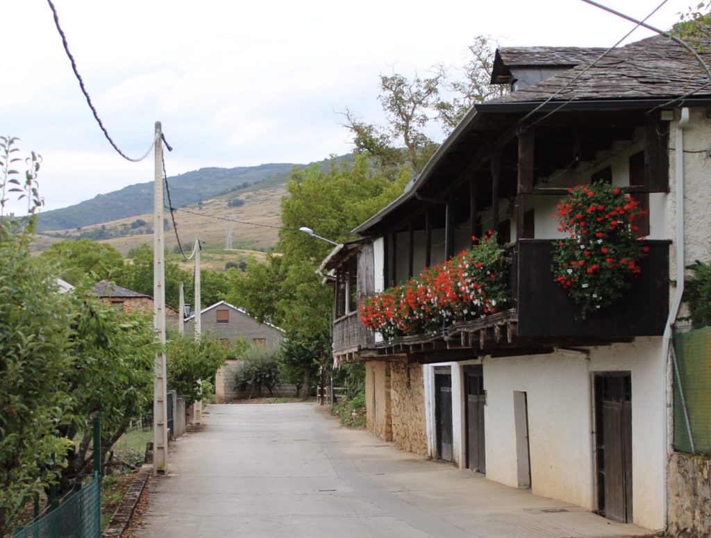 Normally, when you walk the camino, a series of yellow arrows and concrete markers guide you along the way. But now, I would have to find the arrows and try to intuit where the pilgrim was supposed to be coming from. This seemed rather difficult. I soon found, however, that the route was nearly as easy to follow backwards as forwards, and I relaxed into the rhythm of the road. I was not yet in Galicia, but in a part of Castilla y León called El Bierzo. The landscape was hilly, with a light covering of trees, and the ground dry and rocky. In the morning hours it was cool enough for a jacket. The route took me through several small villages, each full of houses that featured a distinctive kind of wooden balcony that I found quite beautiful.