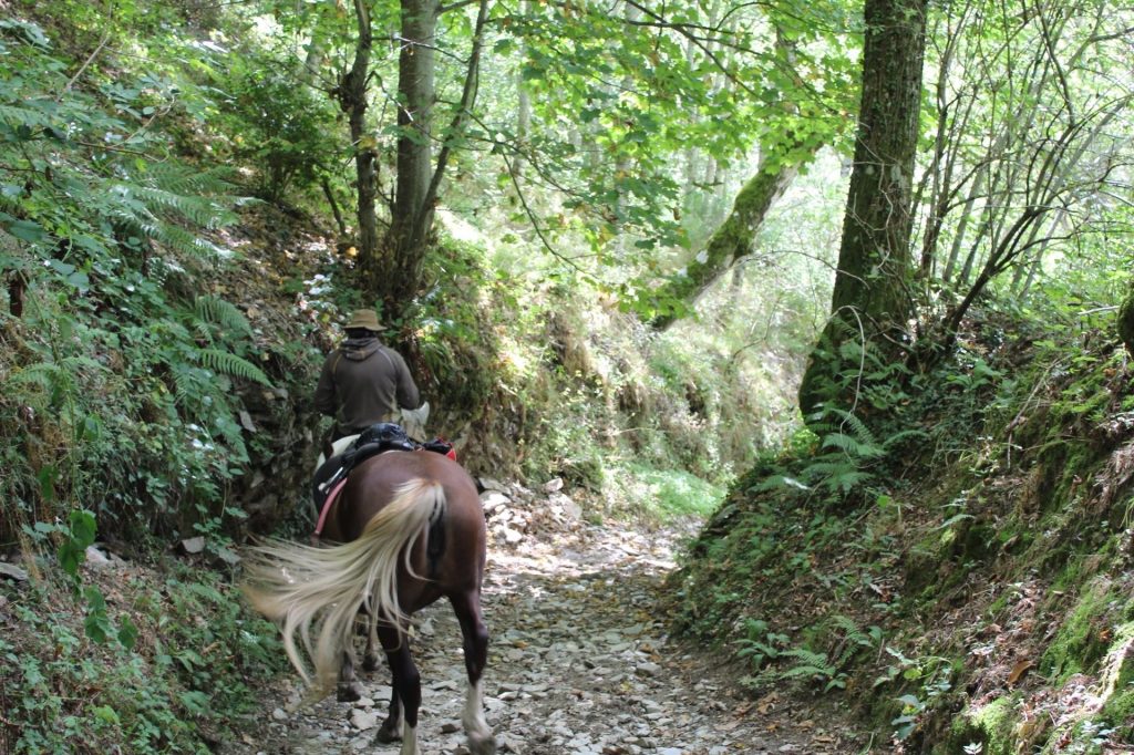 The next thing I knew, I had hit the mountain. The trail led up and up, through a dense forest of oak and birch. It was hard going and after a few minutes I paused to catch my breath. When I did, I looked back to see the shirtless man not far behind, and I got the strange notion that he was after me. This caused me to pick up my pace, and I started rushing up the mountain almost at a run. Besides being irrational, this was a shame since, in retrospect, this was one of the most beautiful stretches of the walk. I climbed and climbed until, near the top, I was surprised by a man on horseback, who was making his way down the steep, rocky path with a great deal of care.