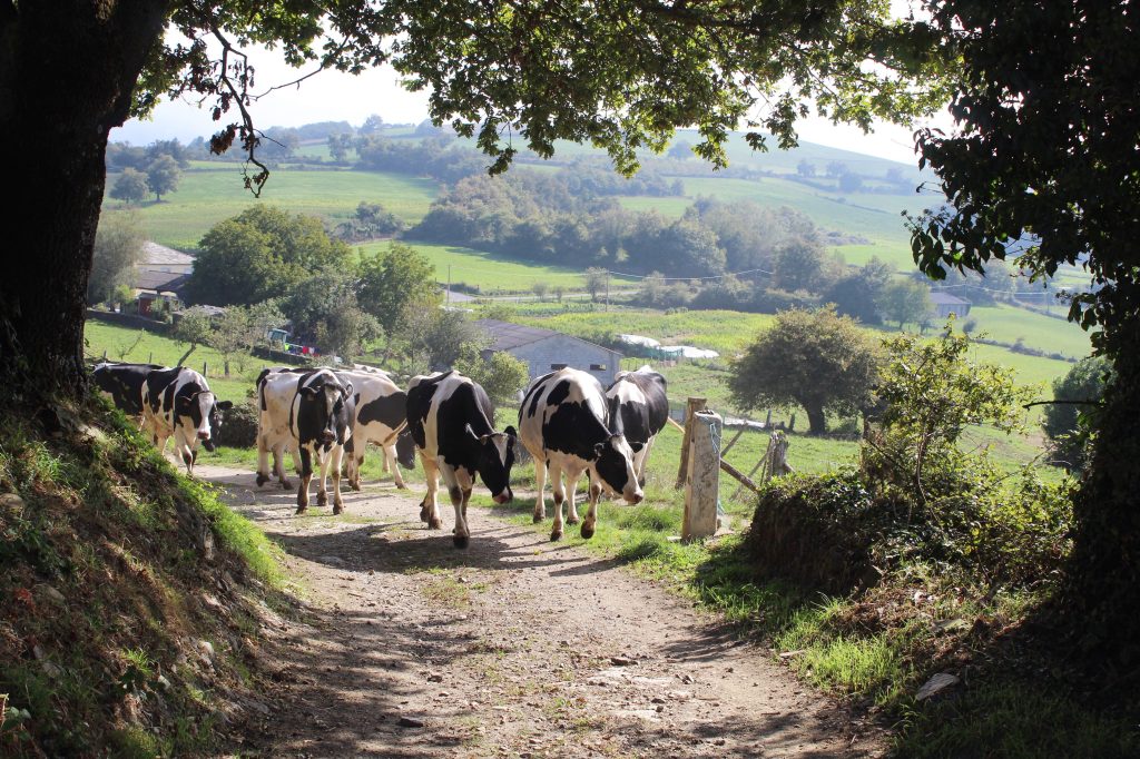 It certainly was. The morning mist rolled up through the valley, obscuring the landscape in a white fog until the sun was finally warm enough to break it up, revealing the ever-green Galicia underneath. Vines clung to trees and moss to rocks. Birds called in the canopy overhead. I shared the road with cows and watchful dogs. Sometimes the path took me up on a hill, offering me a view of the sweet, almost innocent landscape all around me. It is the sort of place that makes city-dwellers want to move to a farm and start milking cows.