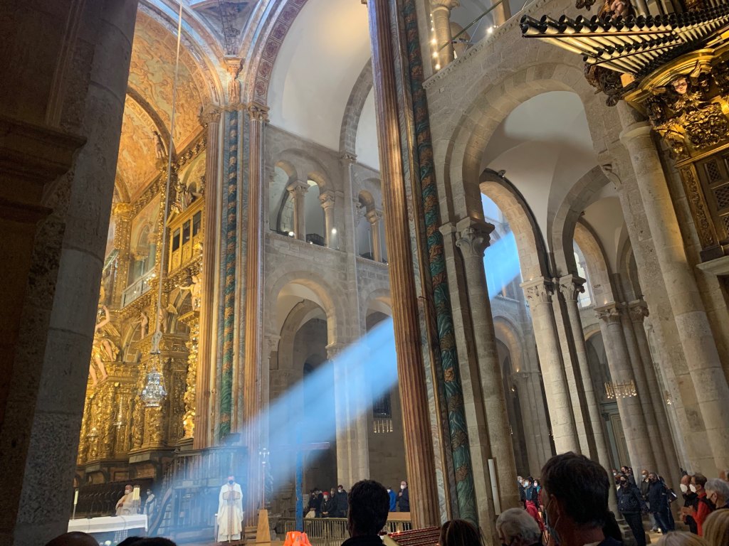 The cathedral was packed. There were lines to get in at every entrance. I arrived nearly an hour early and still had to stand, as the pews were completely occupied. It was obvious at a glance that most of the audience was not there to save their souls. Foreign languages abounded, and cameras were held at the ready. I was certainly no different; but even within this great crowd I tried to temper my expectations. I had been in a similar crowd when the Botafumeiro failed to materialize.