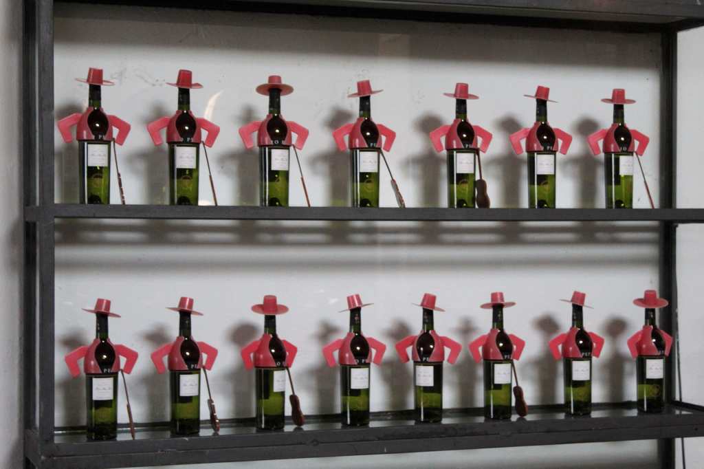 During our time in Jerez, we managed to visit another winery: González Byass. Its name comes from its founder, Manuel María González, and his English agent, Robert Blake Byass. (There is a charming statue of Manuel near the cathedral.) This is possibly the biggest and certainly the most famous producer of sherry. The iconic Tío Pepe fino sherry—whose mascot is a bottle dressed in a red sombrero and jacket, holding a guitar—is from this company. Any visitor to the Puerta del Sol, in Madrid, will recognize it: an advertisement which has been elevated to a symbol of Spain. (An even more famous symbol of Spain, the Osborne Bull, also originated as an advertisement—for sherry brandy.)
