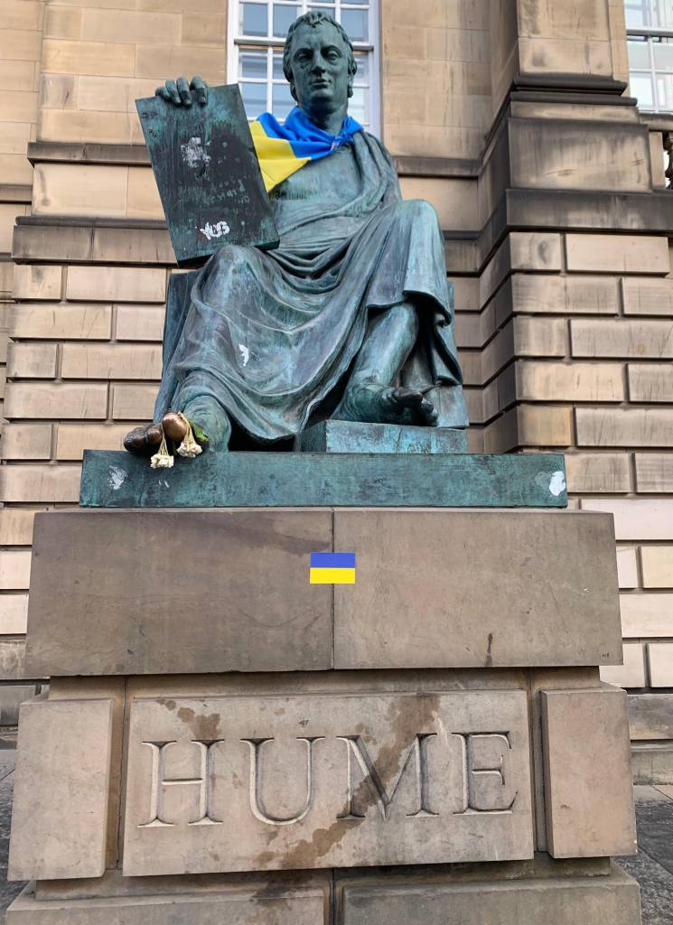 Nearby is a monument to David Hume. The handsome philosopher lounges in a chair, dressed in a toga, and holding a large book. When I visited, however, he was also wearing a Ukrainian flag. This was February 28, 2022, and the Russian invasion of Ukraine had begun just four days earlier. Most commentators had assumed that the battle would be over within the week, perhaps in just three days. So it is stunning to me that, as I sit here over a year later, the war is showing no signs of stopping. I am sure that Hume would have something incisive to say about the folly of mankind in this regard.