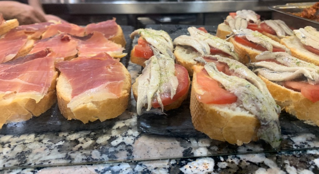 Some tapas waiting to be deployed. The fish on the right are boquerones, anchovies pickled in vinegar. (They’re good!)