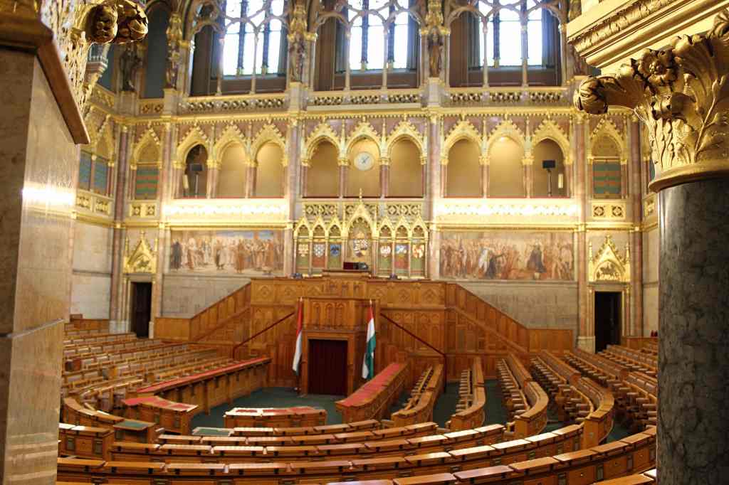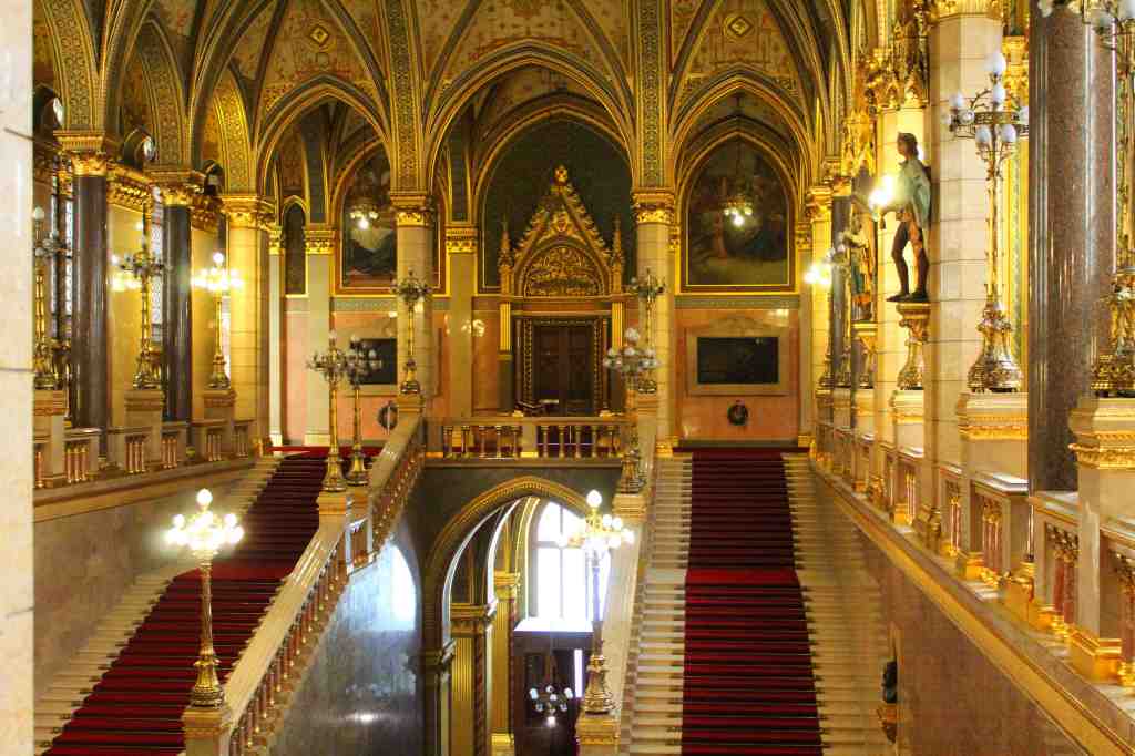 The tour lasted about an hour and took us through just a fraction of the building (it is, after all, the biggest building in the country). But it was a beautiful fraction. Built in 1902, the Hungarian Parliament Building is the soaring, majestic symbol of the country’s sovereignty and democracy. Every inch of it is ornately furnished, with gilded arches, stained-glass windows, and more statues than a cathedral. One highlight is the Assembly Hall, which must be among the most ostentatious settings for a legislative body in the world. The views are stunning, but I can imagine that it gets a little cramped with 199 Members of Parliament and their aides. Another showpiece of the building is the main staircase, which makes the entrances of royal palaces seem tiny by comparison. Right below the central dome is a glass case containing the Holy Crown of Hungary, which tradition states was first worn by St. Stephen himself. It may not be quite that old, but it is a beautiful example of Byzantine craftsmanship. Four liveried soldiers guard the crown, performing an elaborate changing of the guards ceremony every hour.