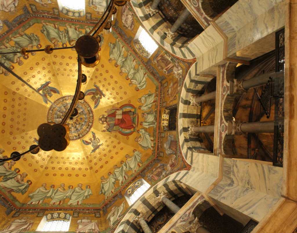 Hanging in the center of this splendid octagon is the so-called Barbarossa Chandelier, named for the Holy Roman Emperor Frederick I (who had a red beard). Looking like a giant crown, its symmetrical shape complements the octagonal space, creating a sort of tunnel view up to the mosaic on top of the cathedral.