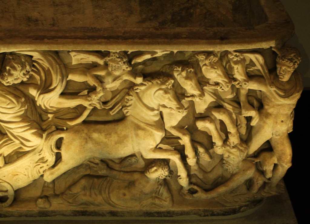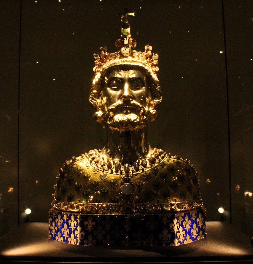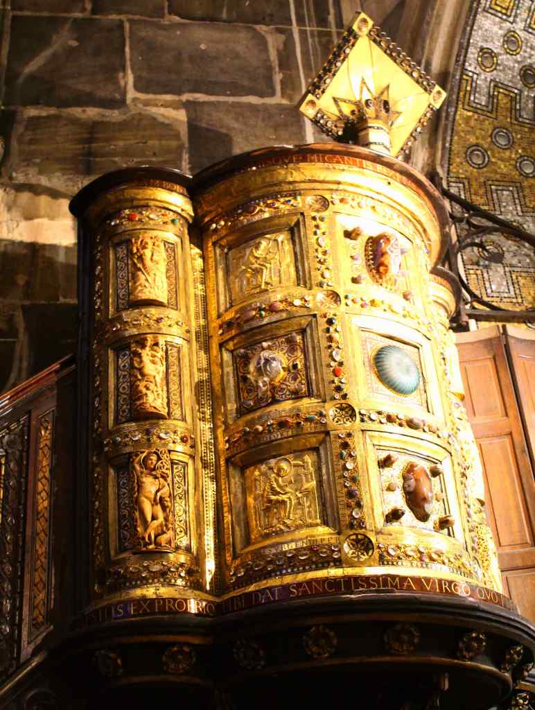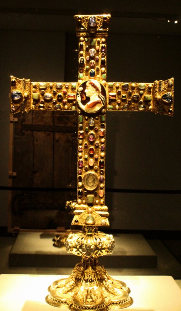 Now, I have been in many cathedral treasuries by now, and most of the time I find them rather uninspiring—usually consisting of gold and silver reliquaries of various shapes and designs. But the artwork on display here was exquisite and unique. There is, for example, the Proserpina sarcophagus. Made of marble and carved in ancient Rome, it was brought here as a symbol of imperial rule by Charlemagne, who was quite possibly buried in it. Also (potentially) belonging to Charlemagne is a hunting horn and knife. But two works of the goldsmith stood out to me as the jewels of the collection.