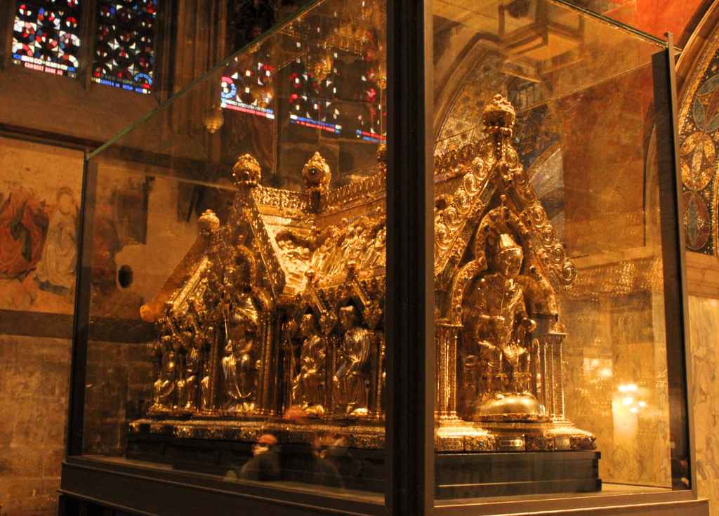 Now it was time to enter the gothic church. The original Palatine Chapel has, you see, been supplemented with a gothic choir, of a much more conventional—not to say unattractive—design. This part of the church also has its share of famous objects. There is, for example, Henry’s Pulpit (also called an “ambon”), which is yet another example of the golden and encrusted style typical of the Carolingian period. It is covered with exquisite ivory carvings and, as typical of the Holy Roman Empire, it incorporates elements of pagan art pillaged from Italy and the Holy Land. Nearby are the Karlsschrein and the Marienschrein, two enormous gold reliquaries. The first contains the bones of Charlemagne himself (moved from the Roman sarcophagus, apparently), while the second is supposed to contain Jesus’ swaddling clothes and a dress belonging to the Virgin Mary. What is indisputable, however, is that these two are remarkable examples of medieval metalworking.