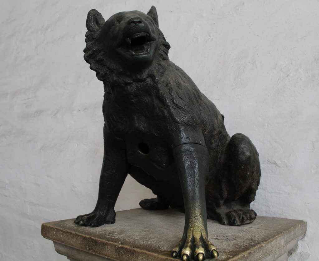 This story (repeated, in various forms, all over Europe and perhaps the world) has some physical manifestations. In the bronze door knocker, for example, there is a bump inside the lion’s mouth, which legend says is the satanic thumb. Once inside, there is a statue of the unfortunate wolf, and opposite that is (for whatever reason) a pine cone.