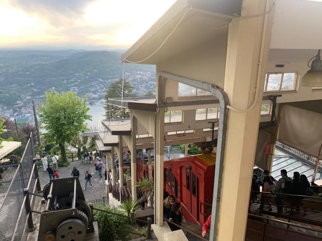 It was getting late now and we needed to find a place for dinner. We decided that we would take the funicular up to Brunate, a small village on top of the nearby hills, and try our luck there. We had to wait in a queue for about ten minutes for it to arrive—a time that was rendered almost intolerable by the presence of a bunch of Erasmus students talking loudly in front of us. (One student, after professing to know “some Spanish,” proceeded to butcher the conjugation of a basic verb in a way I did not think possible.) Finally, the machine arrived and we boarded (as far away as possible from the students). It was a lovely, if crowded, ride, and soon enough we were in the sleepy town of Brunate.