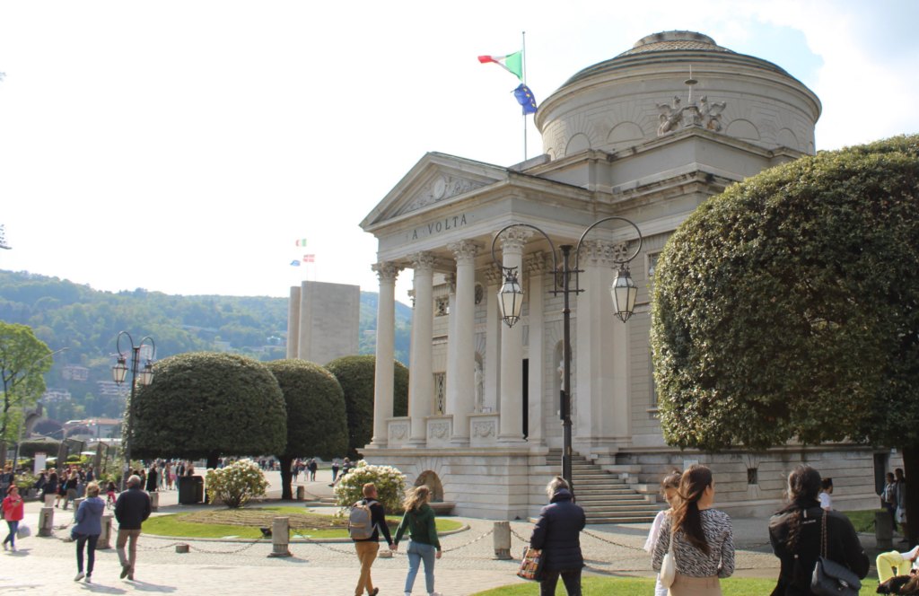 Perhaps I was just sleep deprived and delirious, but I remember this walk with a strange intensity. Everything seemed colorful, new, and interesting. The ferries in the harbor, the blue hangar full of sea planes, the colorful concession stand selling gelato and panini with Italian flags waving on the top… Soon, we came across a large, classical building. This was the Tempio Voltiano, a temple dedicated to Como’s most famous son, Alessandro Volta. It contains some of the great scientist’s devices, including his voltaic piles—the first ever batteries. (Unfortunately, by the time we arrived it was closed.) Nearby is the War Memorial, a large concrete tower dedicated to those who fought and died in World War I. Built in 1933, the memorial looks remarkably more modern than that, perhaps because it was based on a sketch by the Italian futurist Antonio Sant’Elia, who himself was a casualty of the war.