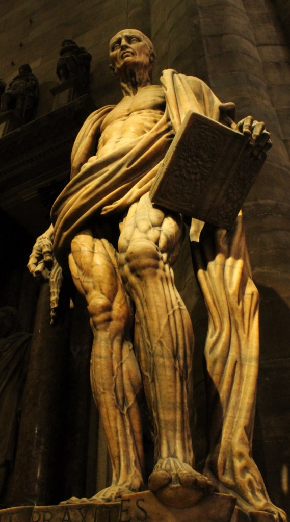 Stepping inside, I was once again astonished by its size. I also thought the interior of the church more restrained and tasteful. The same cannot be said, however, for the cathedral’s most famous statue, Marco d’Agrate’s Saint Bartholemew Flayed. Here we can see the unfortunate saint posing like a Roman senator, his skin wrapped around him like a toga, his muscles, veins, and nerves exposed. It is a kind of tour de force of anatomy, and obviously executed with a great deal of skill. But it is hard to call such a gruesome display a masterpiece.