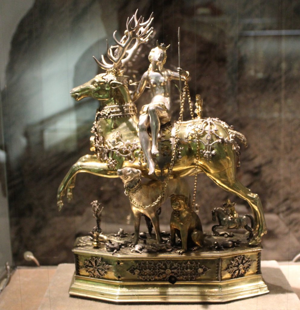 I climbed up the stairs to the main rampart—quite sweaty by now—and bought a ticket for the next guided tour. It would start in about 45 minutes, which gave me some time to visit the castle’s treasury. This is a kind of miniature museum in what appears to be the castle’s dungeon, exhibiting the family’s most valuable possessions. Some of the objects on display are quite fine, exhibiting the prosperity of this aristocratic family. There are, for example, ceremonial crossbows and ornate hunting rifles. And of course, courtly life requires plenty of fine dining. There are ivory drinking vessels, silverware with mother-of-pearl handles, and even a weird mechanical drinking game, a device which participants would wind up and release on the table, dooming one unlucky (or lucky) couple to draining its contents.