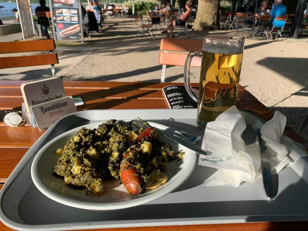 Here, I ordered some sausages and potatoes and a large mug of German beer and sat down on one of the wooden chairs under the shady plain trees. Now, there is something that foreigners ought to know when drinking at a biergarten. The lovely glass mugs (or “steins,” as they are called in English, but not in German!) have proven to be so tempting that many people simply walk off with them as souvenirs. To combat this, one must often pay a deposit, called the “Pfand,” which is normally a euro or so. This amount is then returned to you when you bring the mug back to a special window.