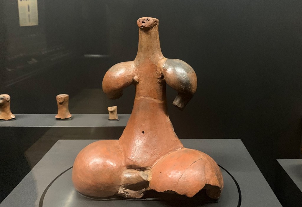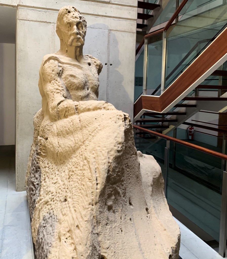 The Museo Canario began in the late 1800s as a kind of private project among a group of intellectuals, under the mistaken belief that the archaeological remains were related with the European paleolithic. Indeed, the museum’s collection is housed in the former home of the leader of this group, Gregorio Chil y Naranjo (who must have been quite a wealthy man). By any standard, the museum’s collection is excellent—with stone tools, ceramics, and even a reproduction of the cave paintings in Galdar (though I wish we had gone to see the originals). Best of all—and strangest—is the so-called “Idol of Tara,” which is a ceramic cult statue depicting a seated woman. Her proportions are, however, rather strange—with enormous thighs and shoulders, but an exceedingly tiny head. Rebe thought it was very funny.