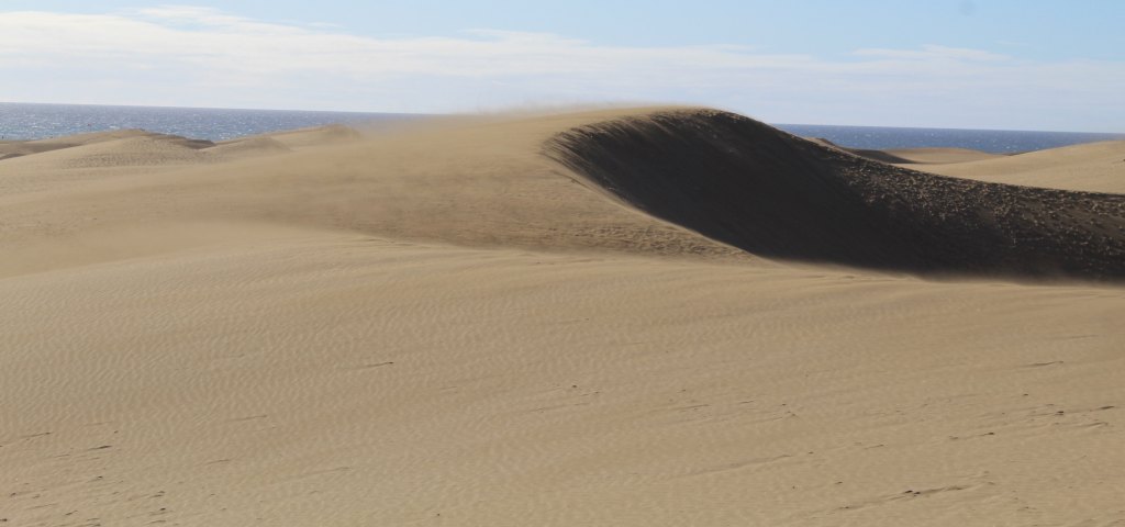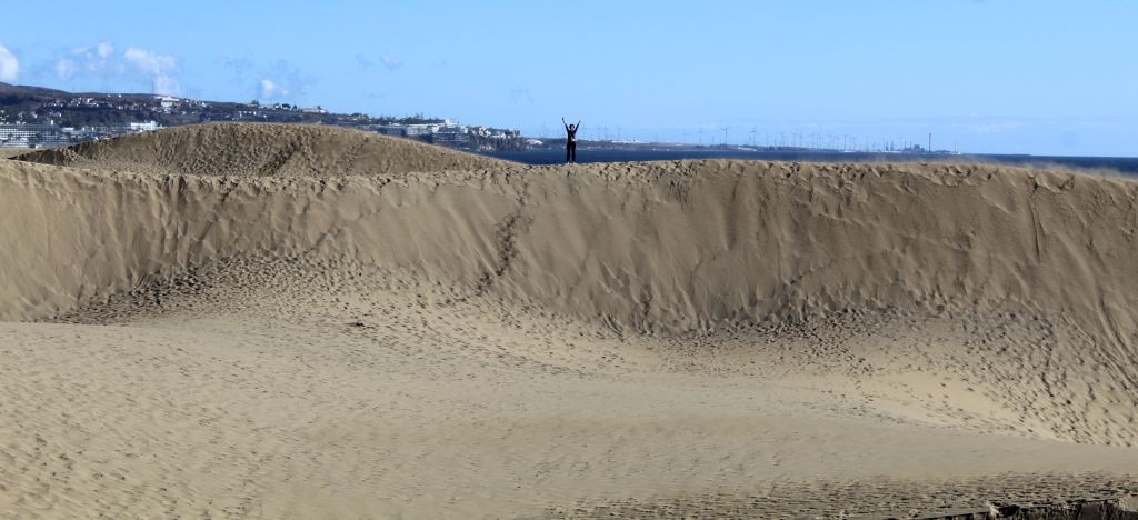 On our next day in Gran Canaria, we headed south. Our first stop was the Maspalomas. We parked the car in a kind of suburban beach community, near an oddly gaudy building that I took for a kind of amusement park (but was actually a shopping center), and started walking towards the ocean. We were there to see the dunes. When they came into view, I was stunned. It is the sort of thing that you expect only to exist in film studios—mountains of sand, rolling into the distance, surrounded by the crystalline blue sea. Apparently, during the last age, when the ocean was considerably lower, sand from the erstwhile ocean floor was washed up. This result of this long geographical process is perfect for Instagram.