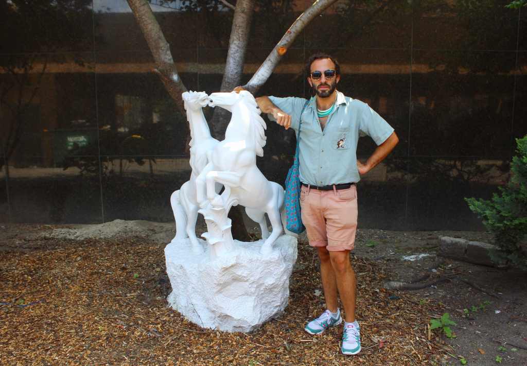 Greg looking phenomenal next to a strange statue adorning an empty parking lot.