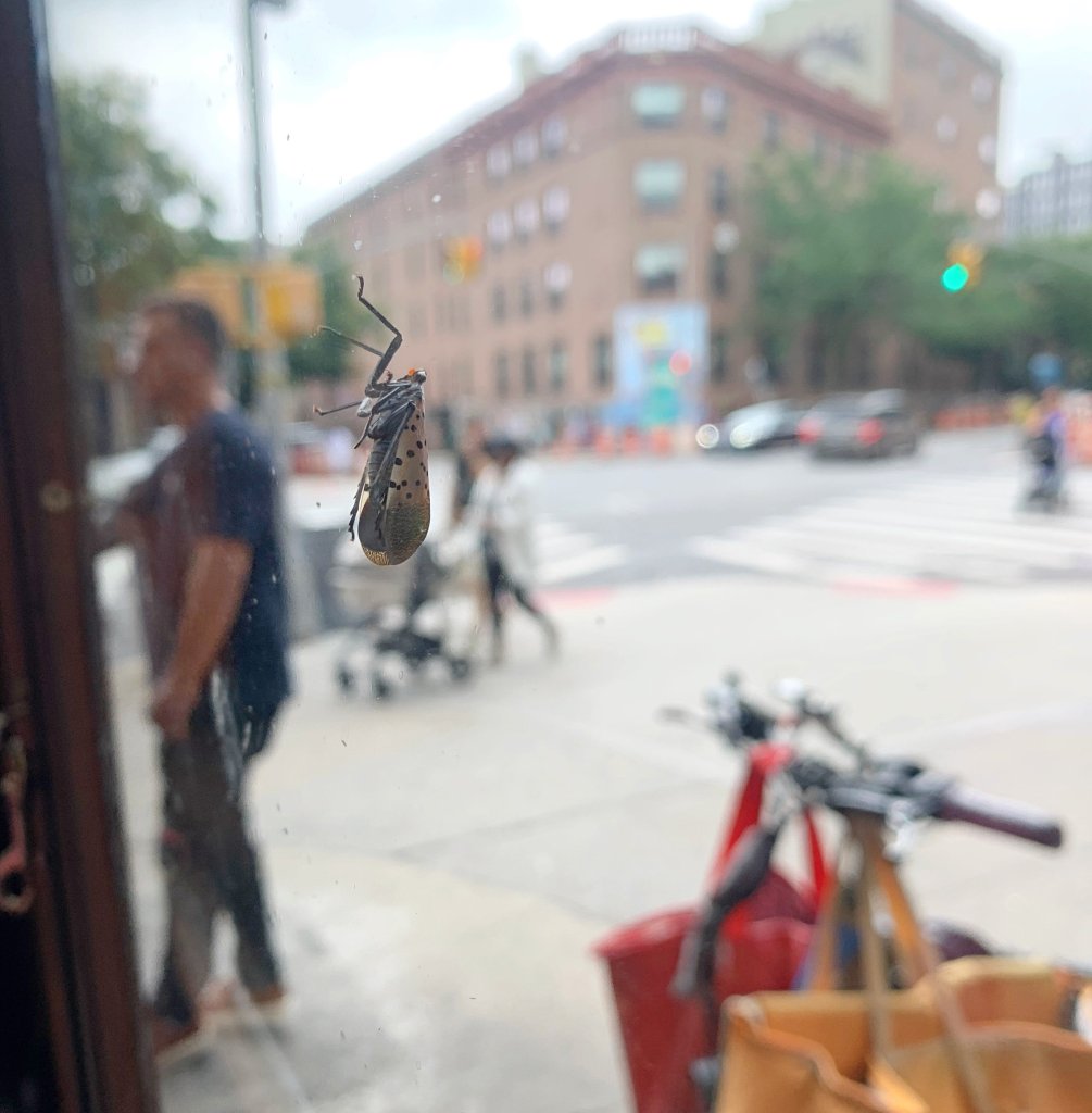 At one point on the walk, the sidewalk narrowed into a kind of tunnel, due to construction on the building next door. And for whatever reason, the pavement was littered with the lifeless bodies of spotted lanternflies. This is an insect pest, originally from southeast Asia, which has spread far and wide due to human activity (they lay their eggs on pieces of wood, which then get transported). Though the insect is actually quite beautiful—with brilliant red wings and an attractive spotted pattern—and though it poses no direct threat to people, New Yorkers were encouraged to kill them on sight for the threat they pose to agriculture and the environment generally.