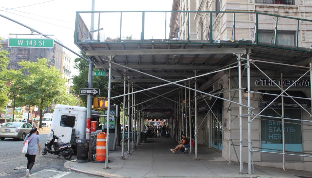 The scaffolds present a kind of obstacle course for the pedestrian. Sometimes they provide needed shade, or a place to lean and hang out; and for many New Yorkers, they become a kind of outdoor living room. They can also narrow the sidewalk and cut off pathways, creating annoying detours and bottlenecks. Businesses hate them for decreasing foot traffic, and tourists for ruining photos of iconic buildings.
