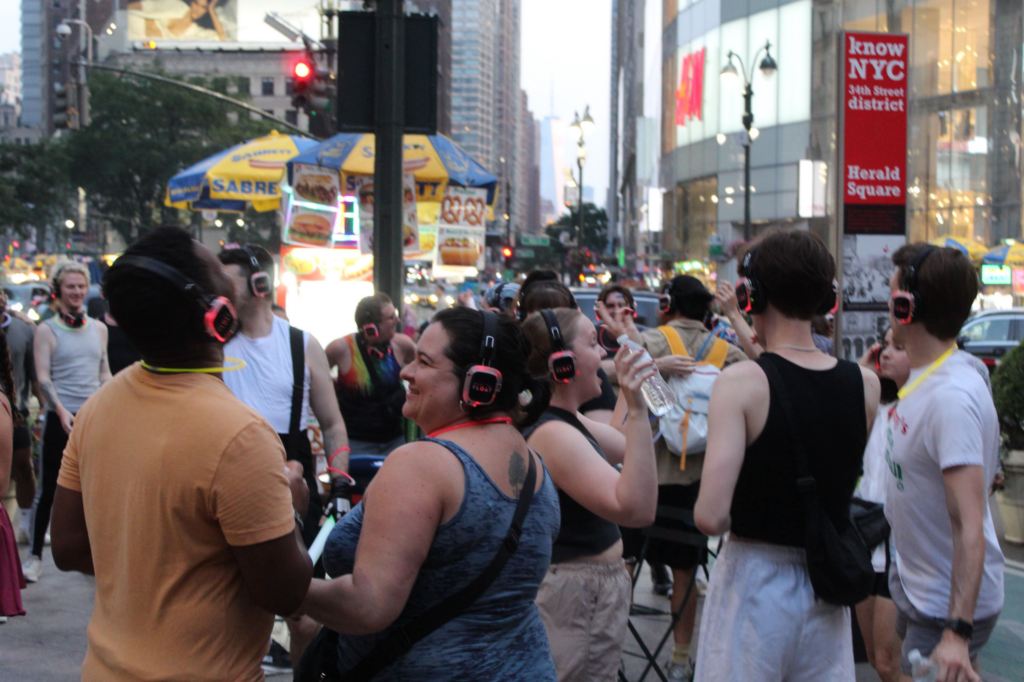 A silent rave we passed, in Herald Square